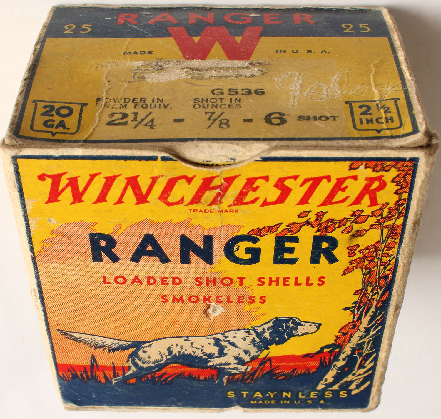 Winchester, Ranger, 20ga, 1pc., 2 1/2'', Empty, Shot Size 6, multi colored box with dog on point, box has light edge wear & light scuffing with great colors. Grade: Very Good ++ - Value: 20 to 60
