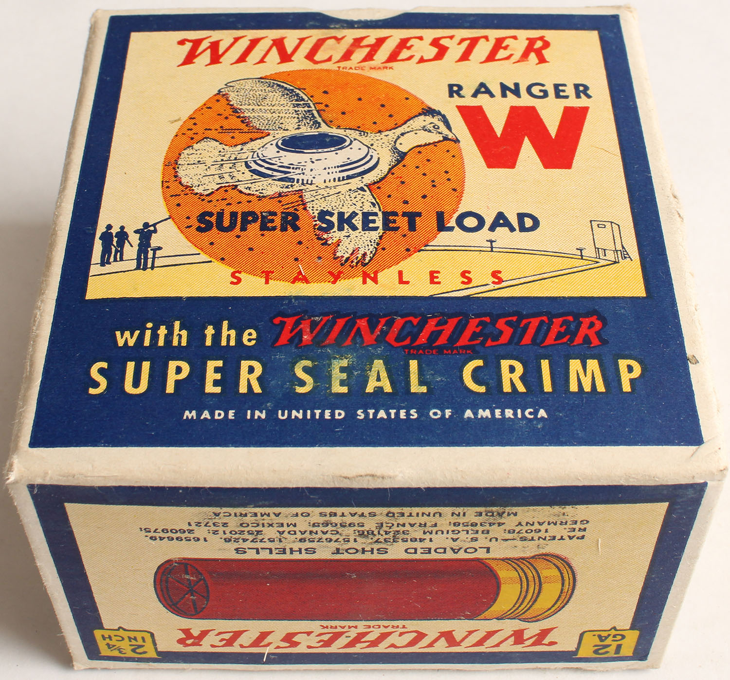 Winchester, Ranger Super Skeet Load, Hercules Red Dot, 12ga, 1pc., 2 3/4'', Full, White, blue & red box that pictures flying Quail with skeet in body & shot all around, Loading: 3 Drams, 1 1/8 Oz., No. 9 Shot, Box is very solid with light edge wear & great colors, Shells are excellent. Grade: Excellent ++ - Value: 50 to 150