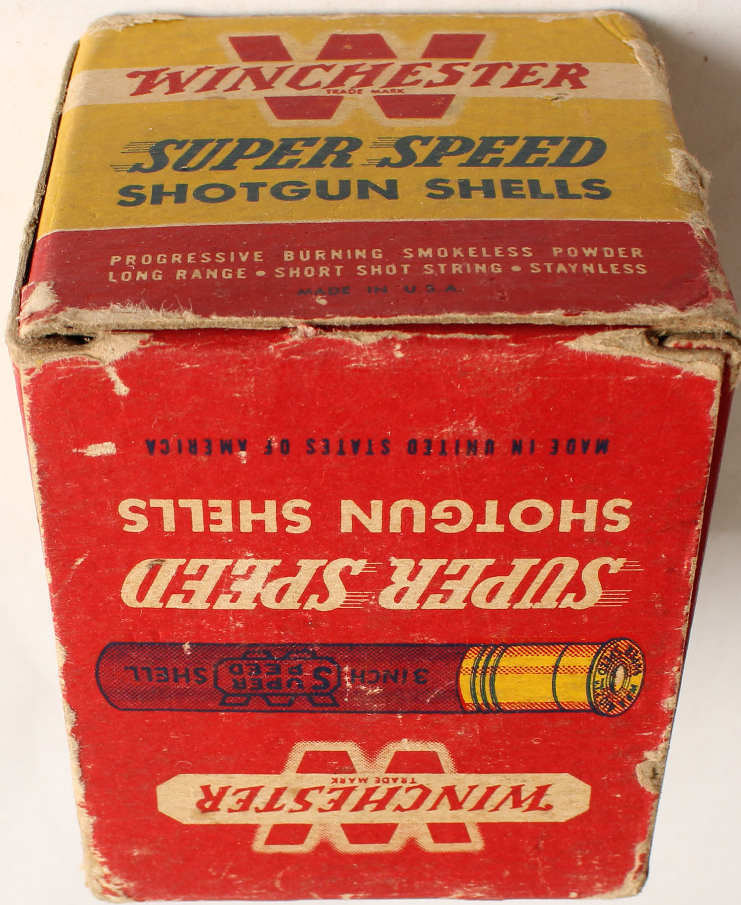 Winchester, Super Speed, 410ga., 3'', 1pc., Full, shot size 7 1/2, red, black and yellow box, box has edge wear, light age soiling & inside top flap is torn with very nice colors, shells are excellent. Grade: Very Good ++ - Value: 10 to 40