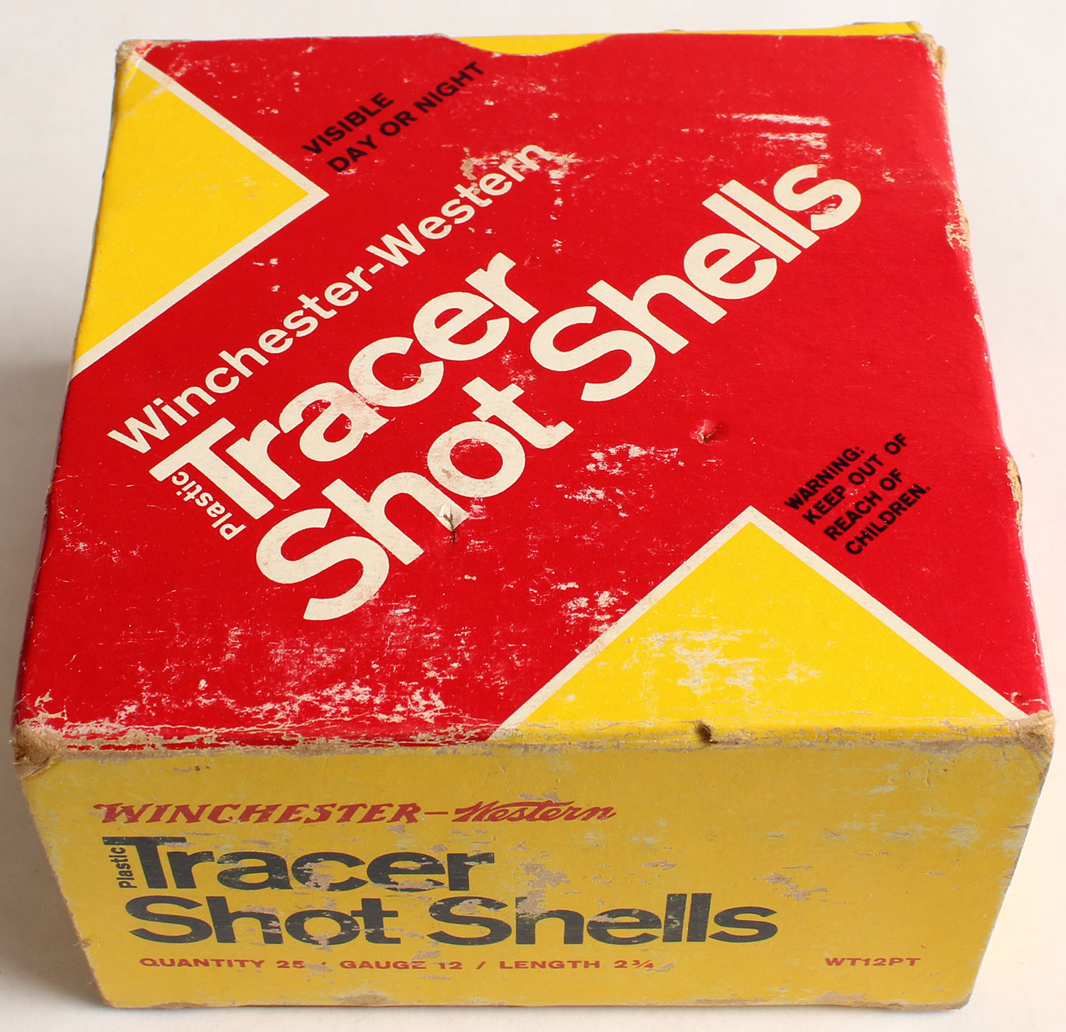 Winchester-Western, Tracer Shot Shells, Visible Day or Night, 12ga., 2 3/4'', 1pc., Full, shot size 8, multi-colored box, box has light edge wear & scuffing with nice colors, shells are very good. Grade: Very Good ++ - Value: 10 to 50