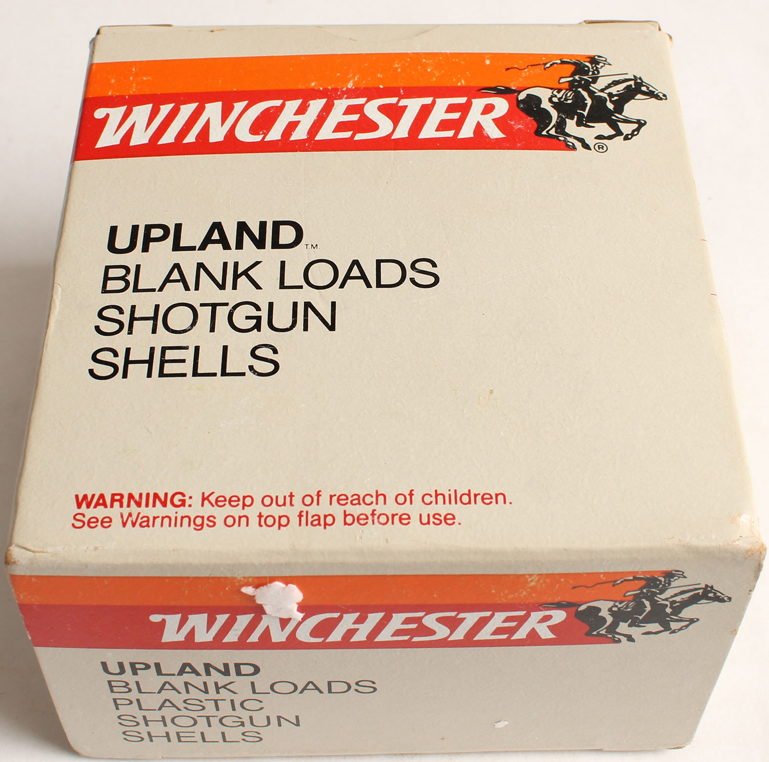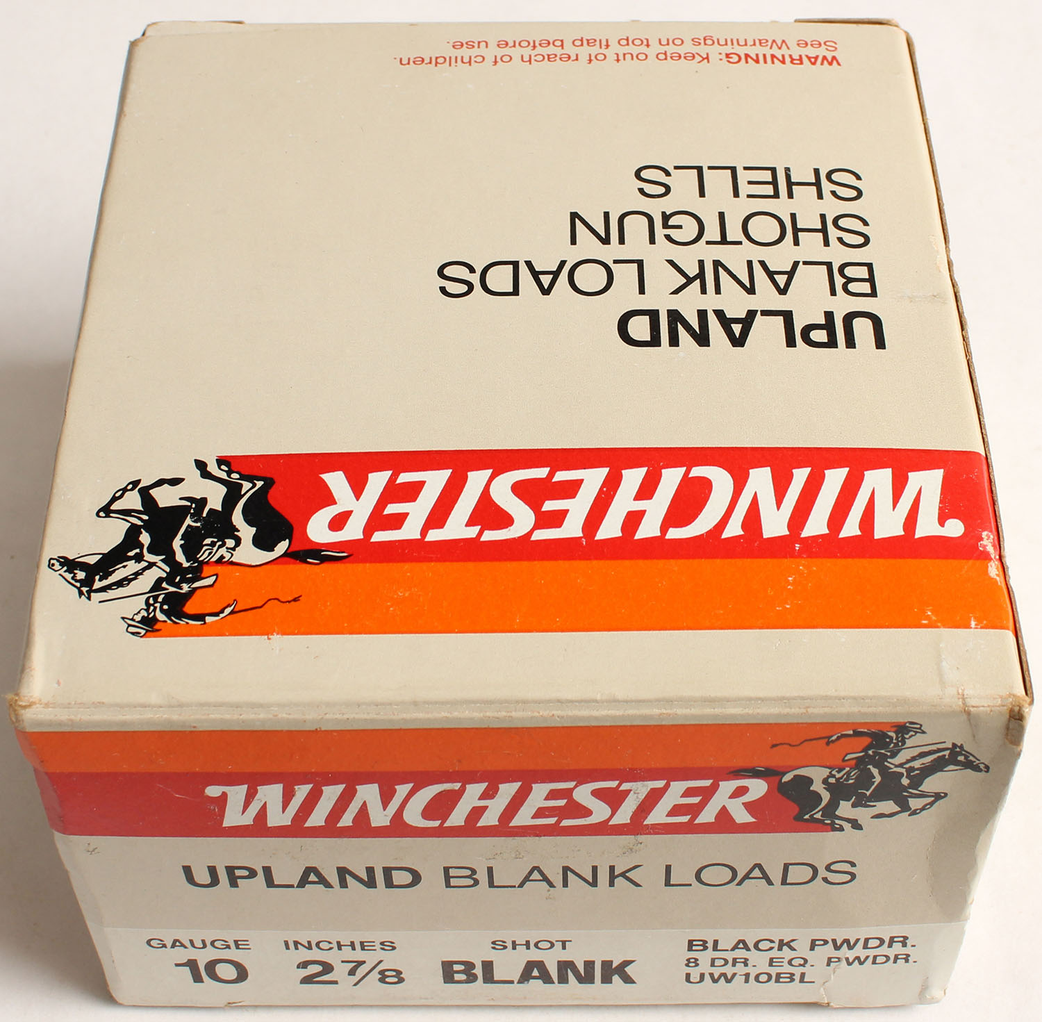 Winchester, Upland, 10ga., 2 7/8'', 1pc., Full, shot size Blank Loads, multi-colored box, box is very solid with great colors, shells are good but the brass is corroded due to the black powder. Grade: Excellent - Value: 10 to 40