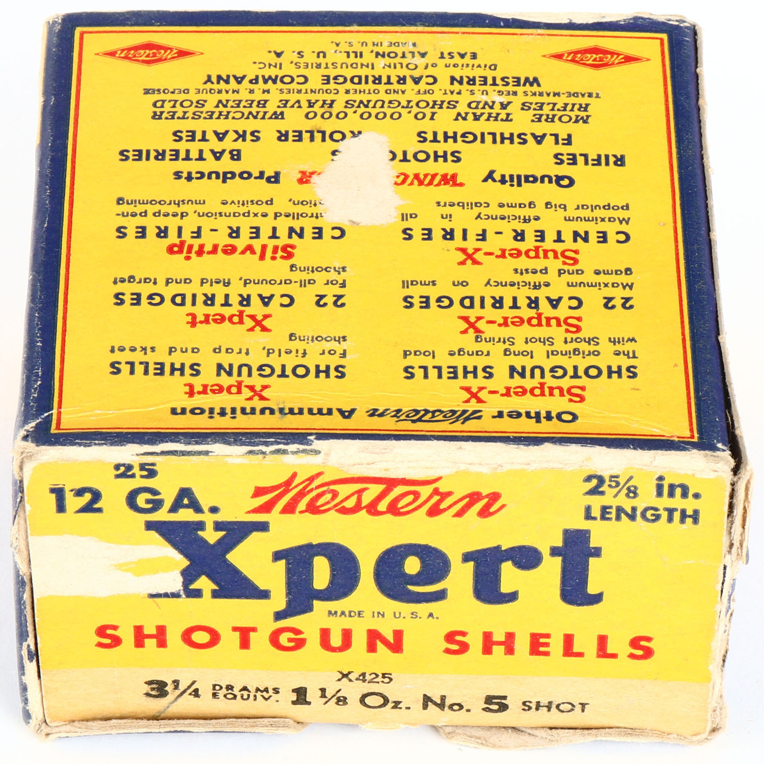 Western, Xpert, 12ga., 1pc., Partial 12rds., shot size 5, 2 5/8'', multi-colored box, box has light scuffing & light edge wear with very nice color & top inside flap is disconnected, shells are excellent. Grade: Very Good ++ - Value: 10 to 30