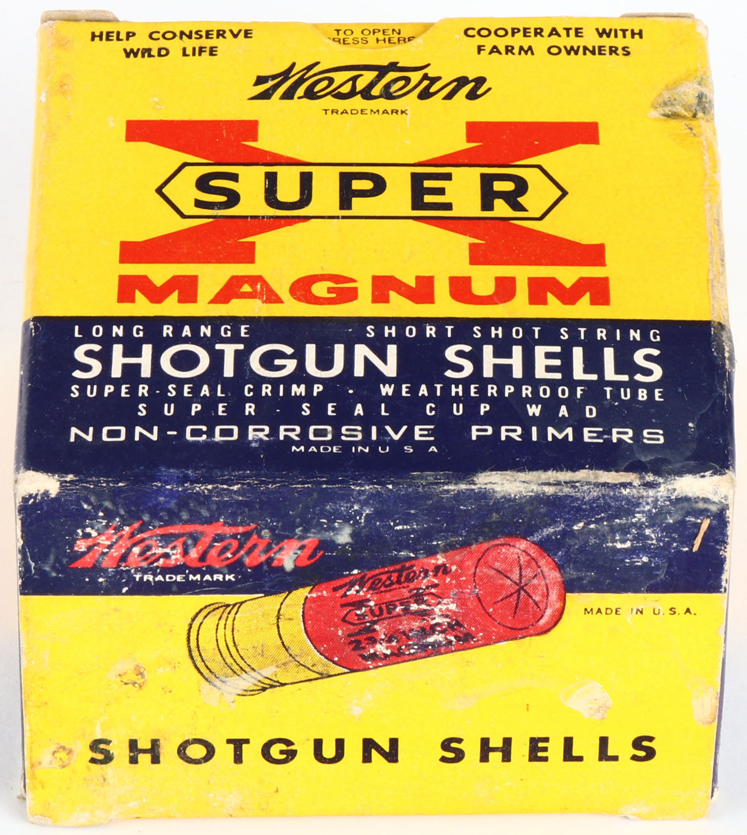 Western, Super X Magnum, with Insert, 16ga., 1pc., Full, shot size 6, 2 3/4'', multi-colored box, box has edge wear & light soiling with very nice color, shells are excellent. Grade: Very Good ++ - Value: 10 to 30