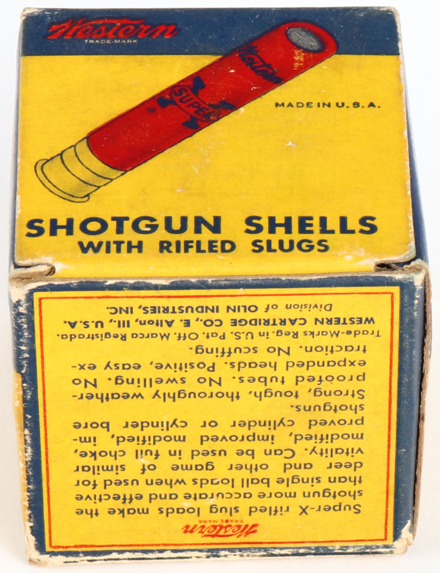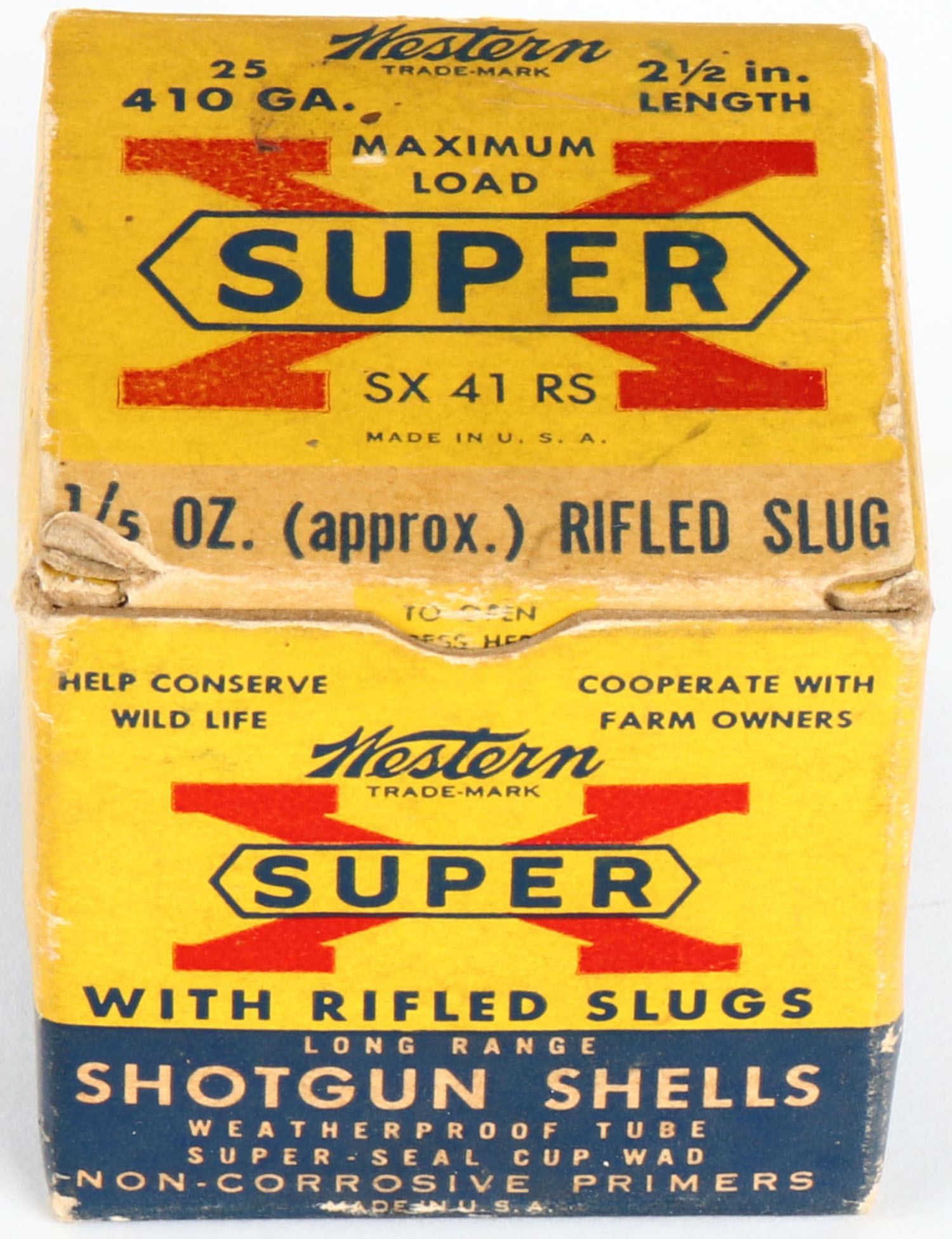 Western, Super X, 410ga., 1pc., Full, shot size Rifled Slug, 2 1/2'', multi-colored box, box has light edge wear & light soiling with very nice color, shells are excellent. Grade: Very Good ++ - Value: 10 to 40