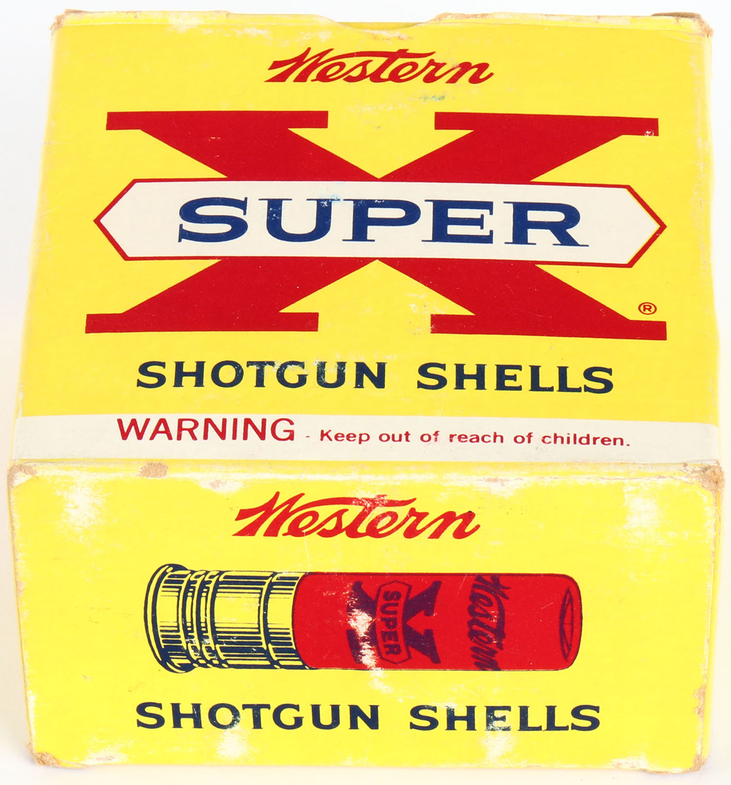 Western, Super X, 10ga., 1pc., Full, shot size 4, 2 7/8'', multi-colored box, box is solid with light soiling & very nice color, shells are excellent. Grade: Very Good ++ - Value: 10 to 40