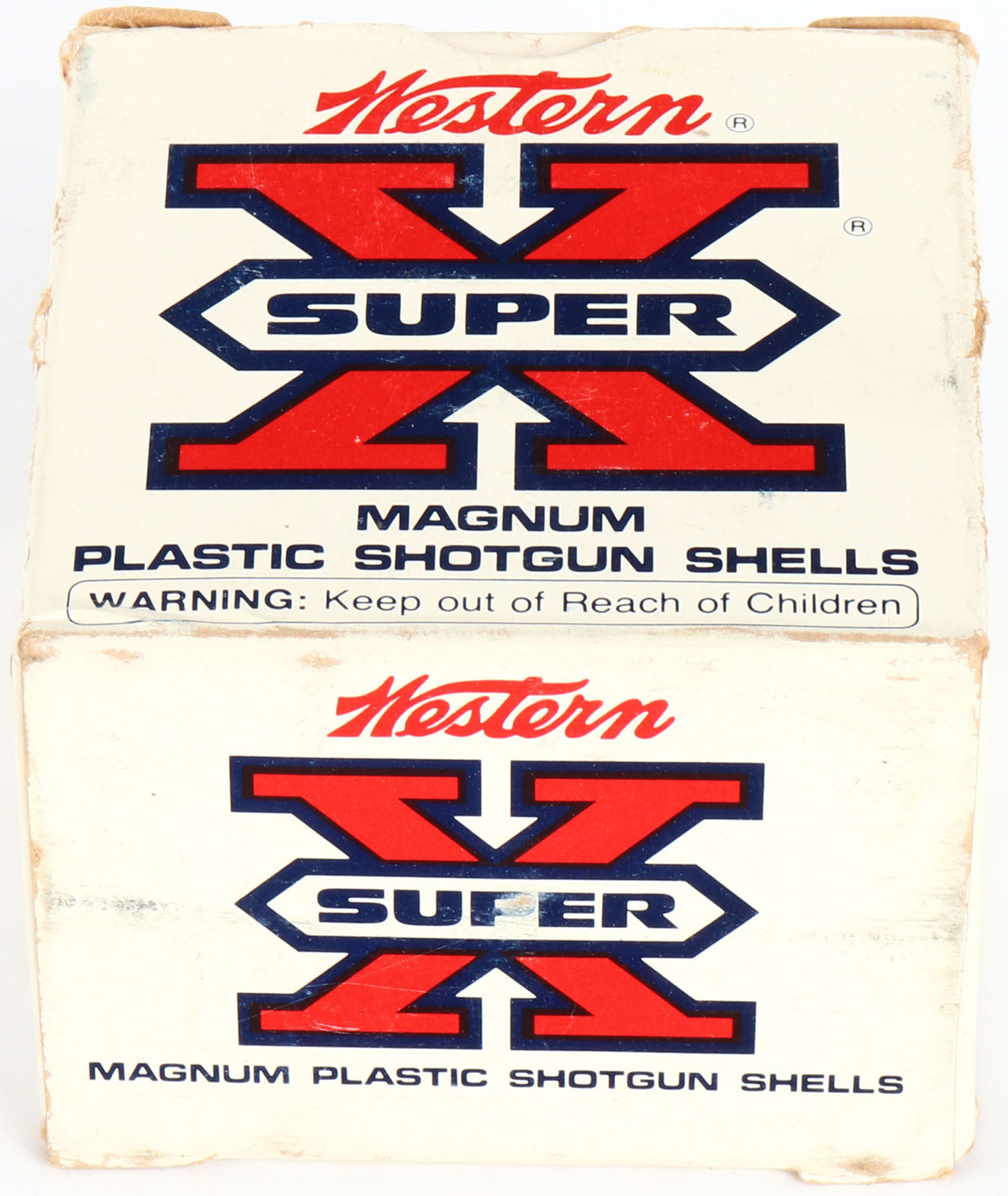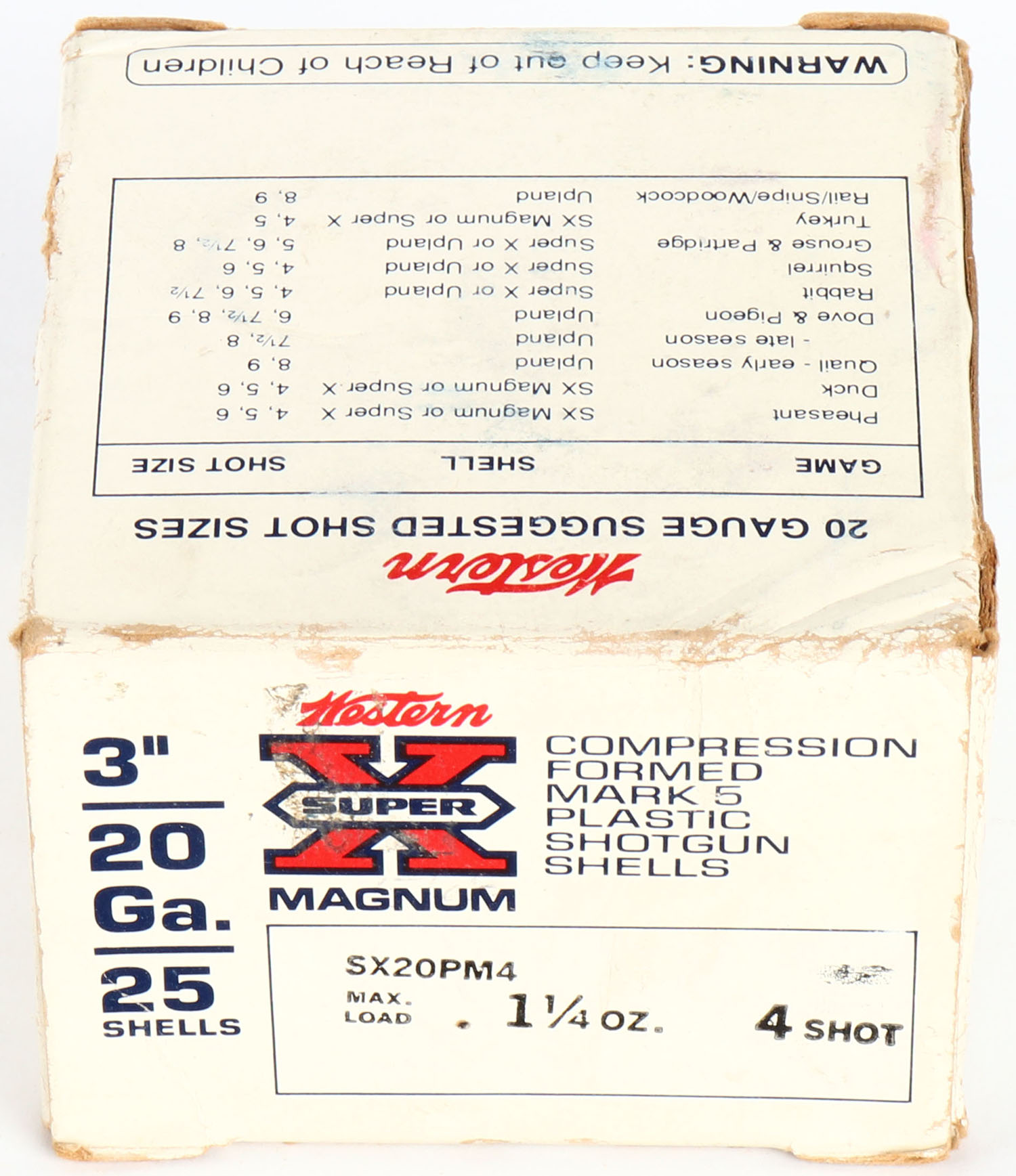 Western, Super X, 20ga., 1pc., Full, shot size 4, 3'', multi-colored box, box is solid with edge wear, light scuffing & nice color, shells are excellent. Grade: Very Good ++ - Value: 10 to 40