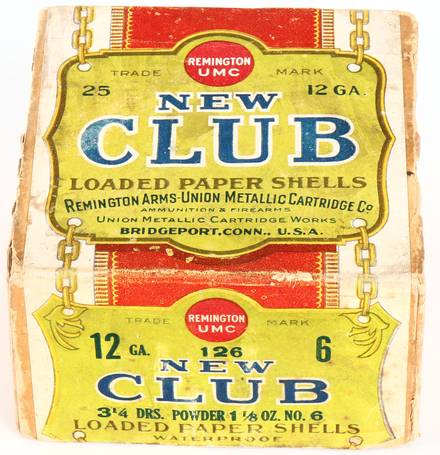 Remington UMC, New Club, 12ga, 2pc., Empty, shot size 6, buff box with green, blue & red paper label, box has tape repair, seam splits & light soiling with very nice color to label. Grade: Very Good ++ - Value: 20 to 80