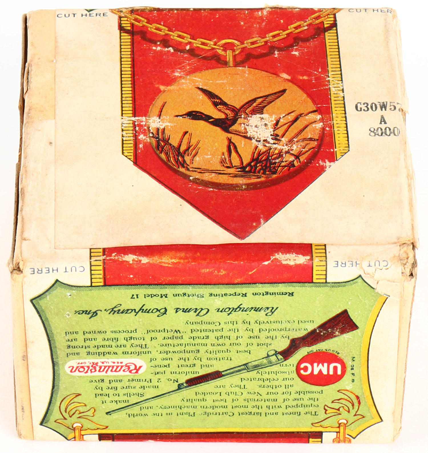 Remington UMC, New Club, 20ga, 2pc., FULL and SEALED, Loading: 2 1/2 Drs. 7/8 Oz. No. 6, buff box with green, yellow, blue & red paper label, box has light scuffing & light edge wear. Grade: Excellent - Value: 100 to 400