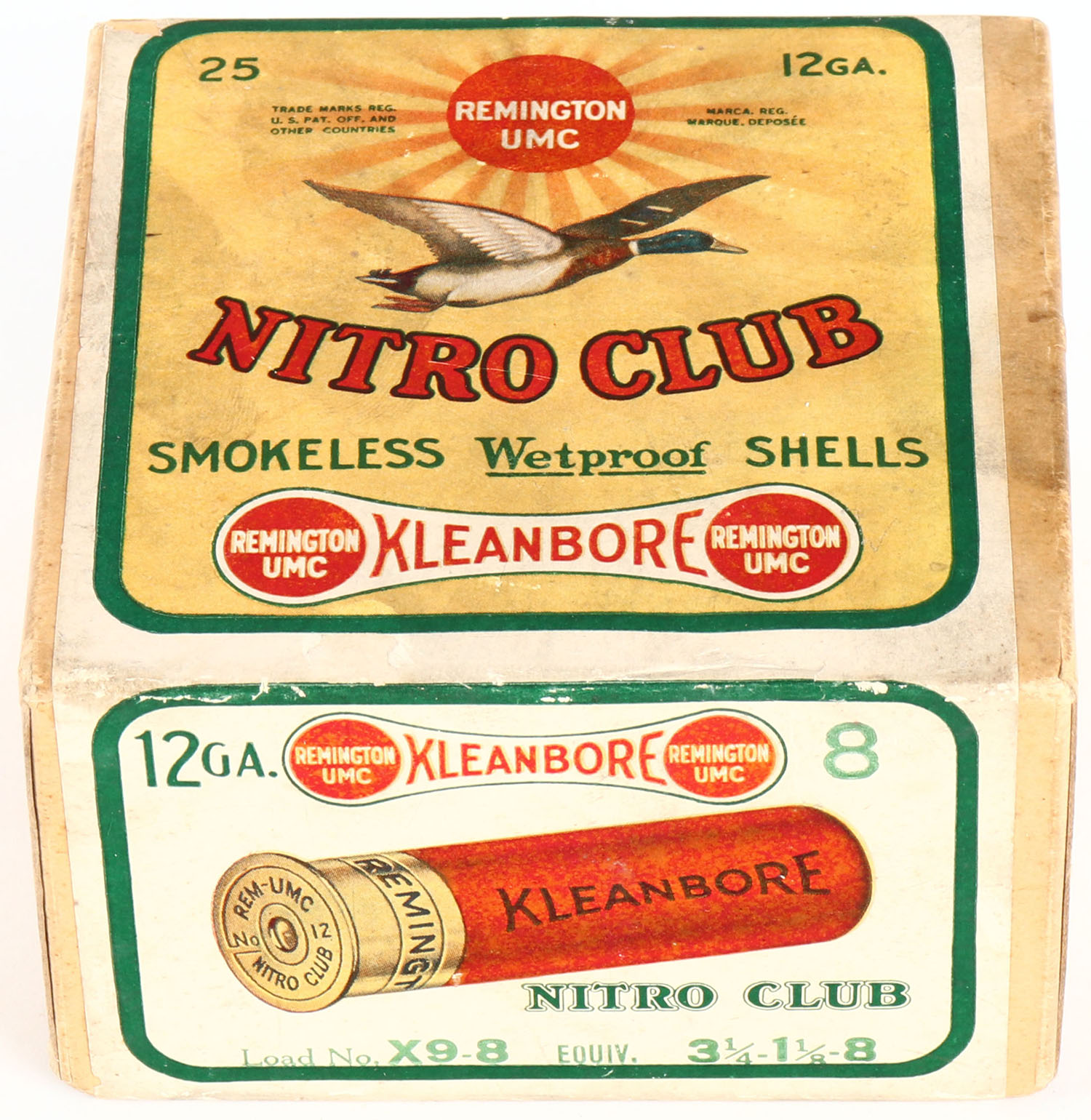 Remington UMC, Nitro Club, 12ga., 2pc., FULL and SEALED, Loading: 3 1/4 Drs. 1 1/8 Oz. No. 8, buff box with sunburst logo & Mallard flying on top, box has very nice colors with light soiling & small shell protrusions. Grade: Excellent - Value: 100 to 400