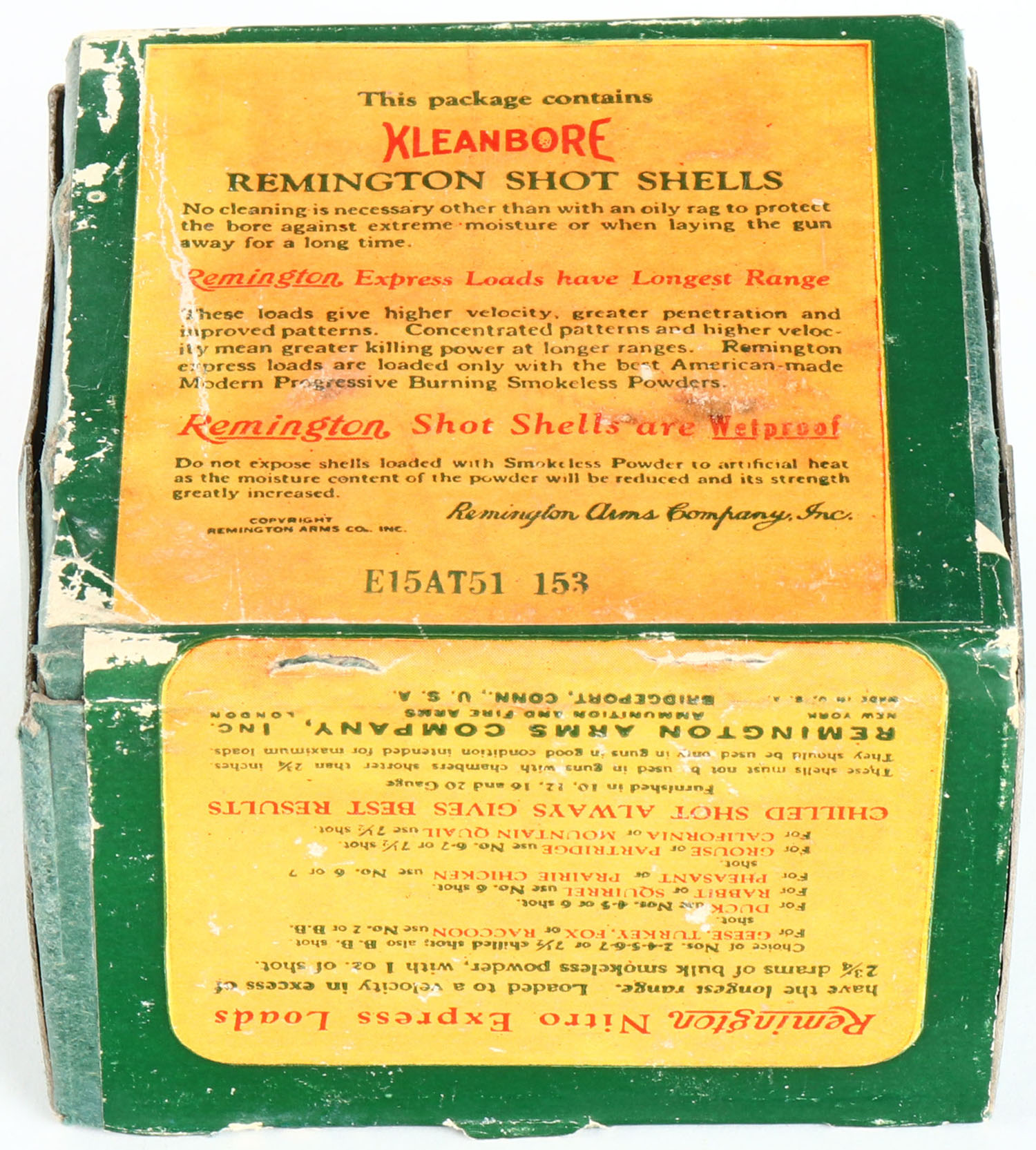 Remington Nitro Express, Long Range Game Loads, 20ga., 2 3/4'', 2pc., FULL & SEALED, shot size 5 CH, green box with sunburst logo & MALLARD in flight on side, box has shell protrusions, light edge wear & light scuffing with great colors. Grade: Very Good ++ - Value: 60 to 250