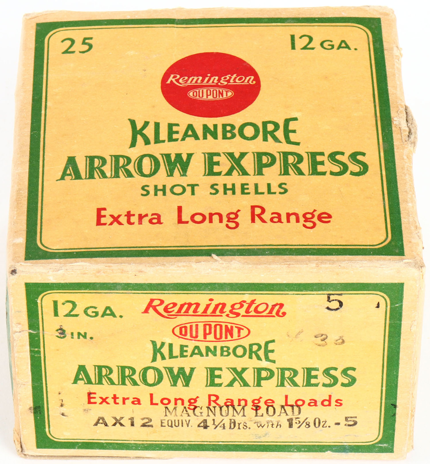 Remington, Kleanbore, ARROW EXPRESS, 12ga., 3'', 1pc., Full, shot size 5 Magnum, box is buff, yellow, red and green, box has shell protrusions & edge wear with nice colors, shells are excellent. Grade: Very Good ++ - Value: 20 to 60