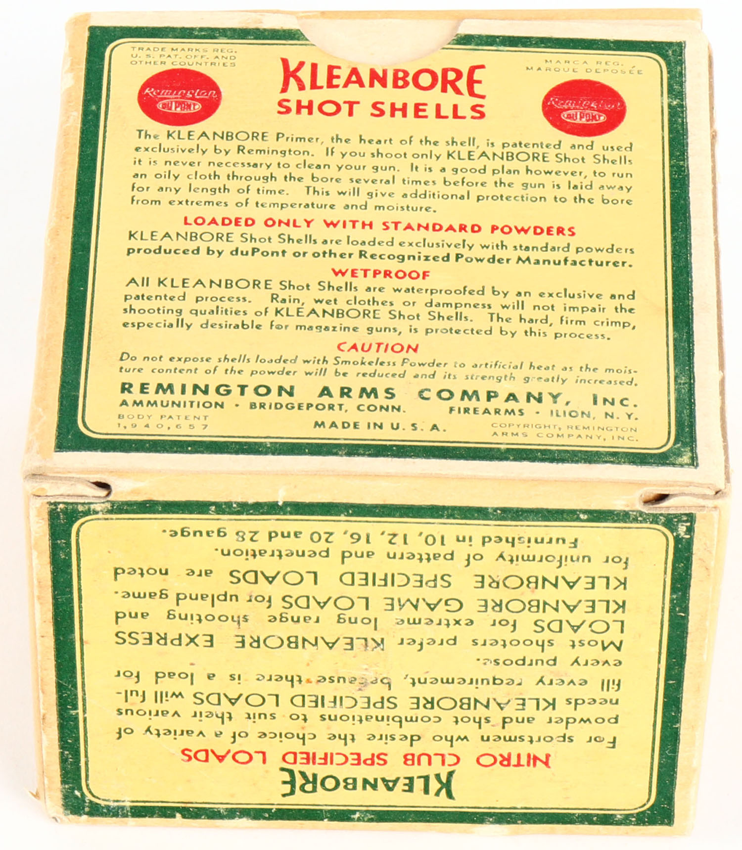 Remington, Kleanbore, NITRO CLUB SHELLS, 28ga., 1pc., Full, shot size 6C, box is buff, yellow, red and green, box has disconnected top flap, light soiling to top flap & light edge wear, with very nice colors, shells are excellent. Grade: Very Good ++ - Value: 20 to 60