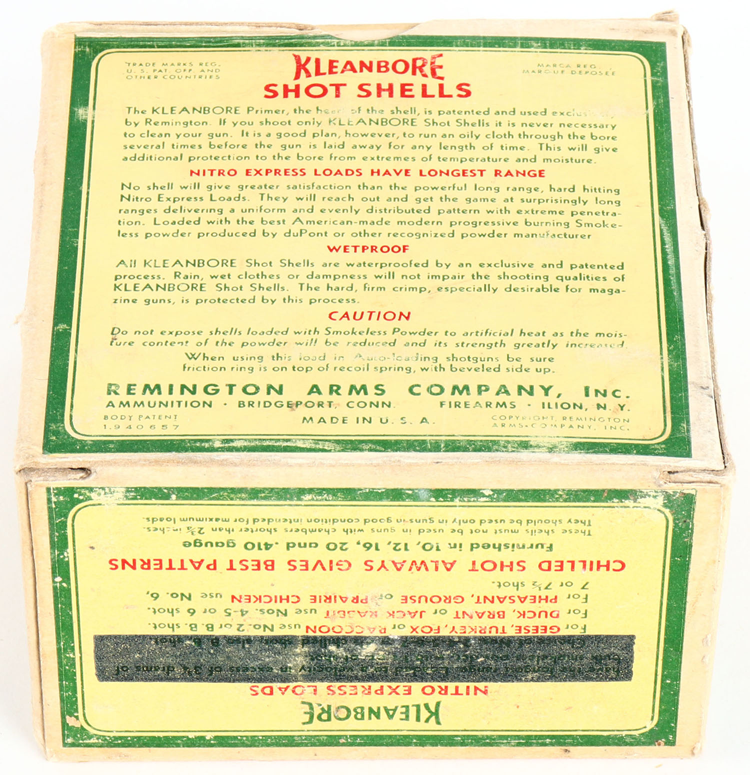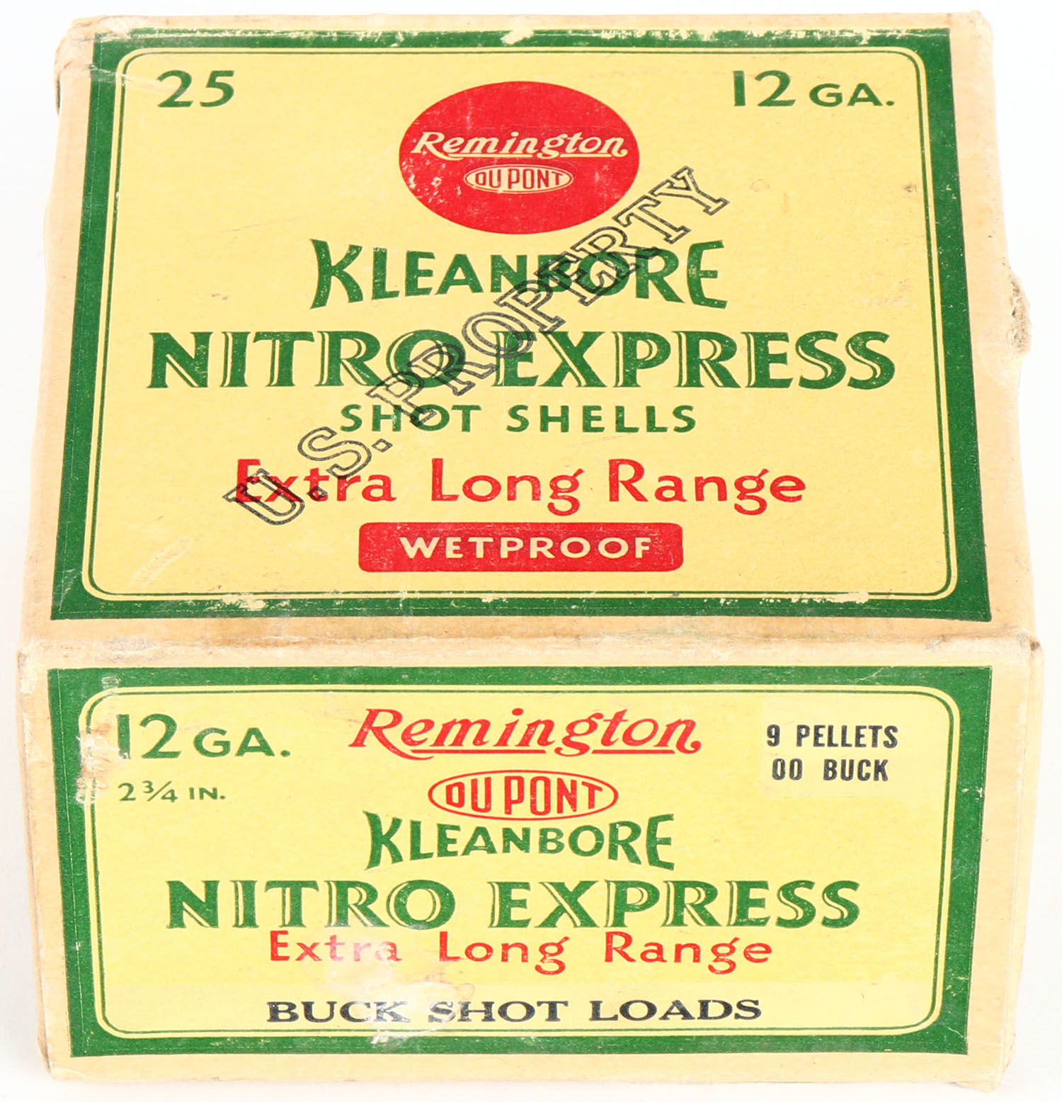 Remington, Kleanbore, NITRO EXPRESS, U.S. Property, 12ga., 2 3/4'', 1pc., Full, shot size 00 Buck 9 Pellets, box is buff, yellow, red and green, box has light edge wear & light scuffing with very nice colors, shells are excellent. Grade: Very Good ++ - Value: 20 to 60