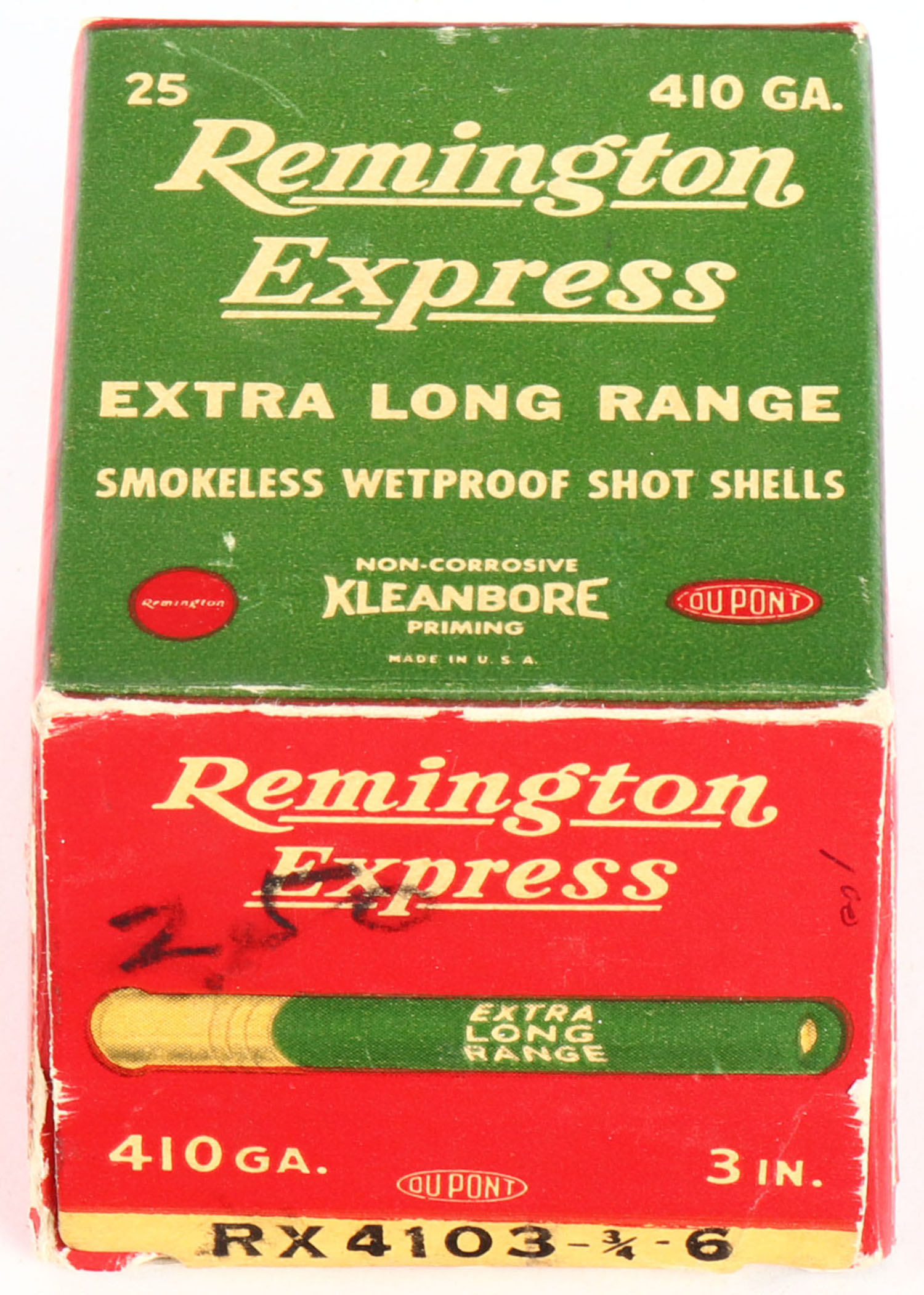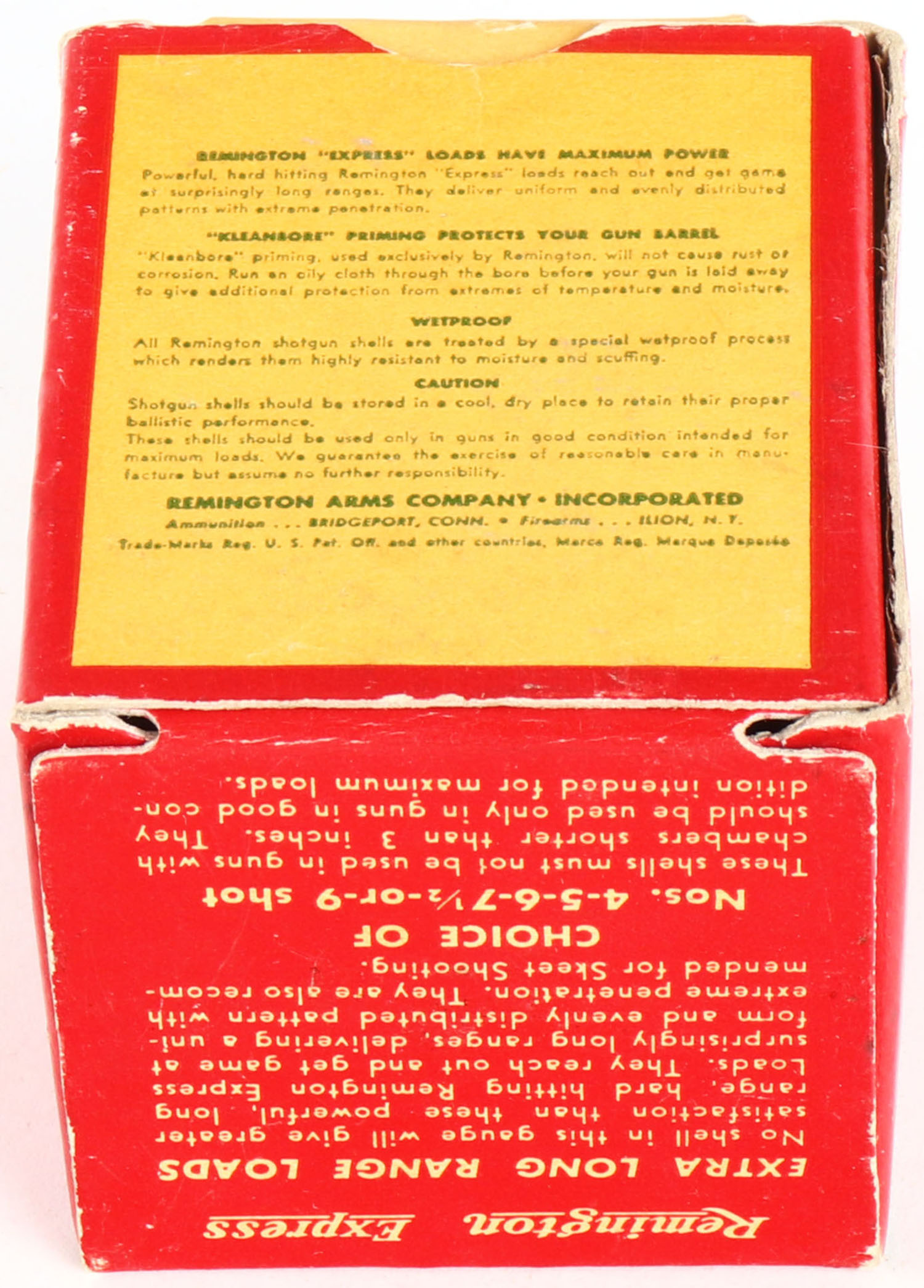 Remington Express, Extra Long Range, 410ga., 3'', 1pc., Full with 8rds being incorrect shot size, shot size 6, box is white, yellow, red and green, box is very solid with very nice colors, shells are very good. Grade: Excellent - Value: 10 to 50