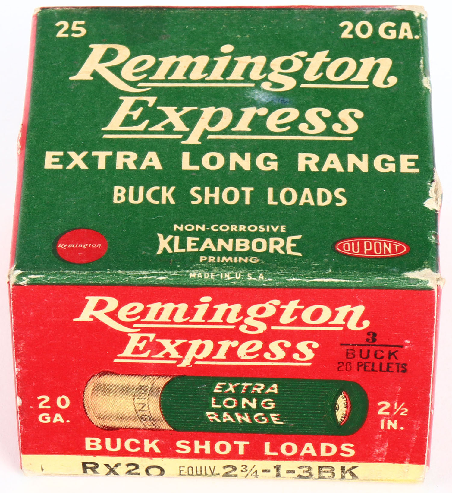 Remington Express, Extra Long Range, 12ga., 2 1/2'', 1pc., Full, shot size 3 Buck 20 Pellets, box is white, yellow, red and green, box has small shell protrusions with very nice colors, shells are excellent. Grade: Very Good ++ - Value: 10 to 50