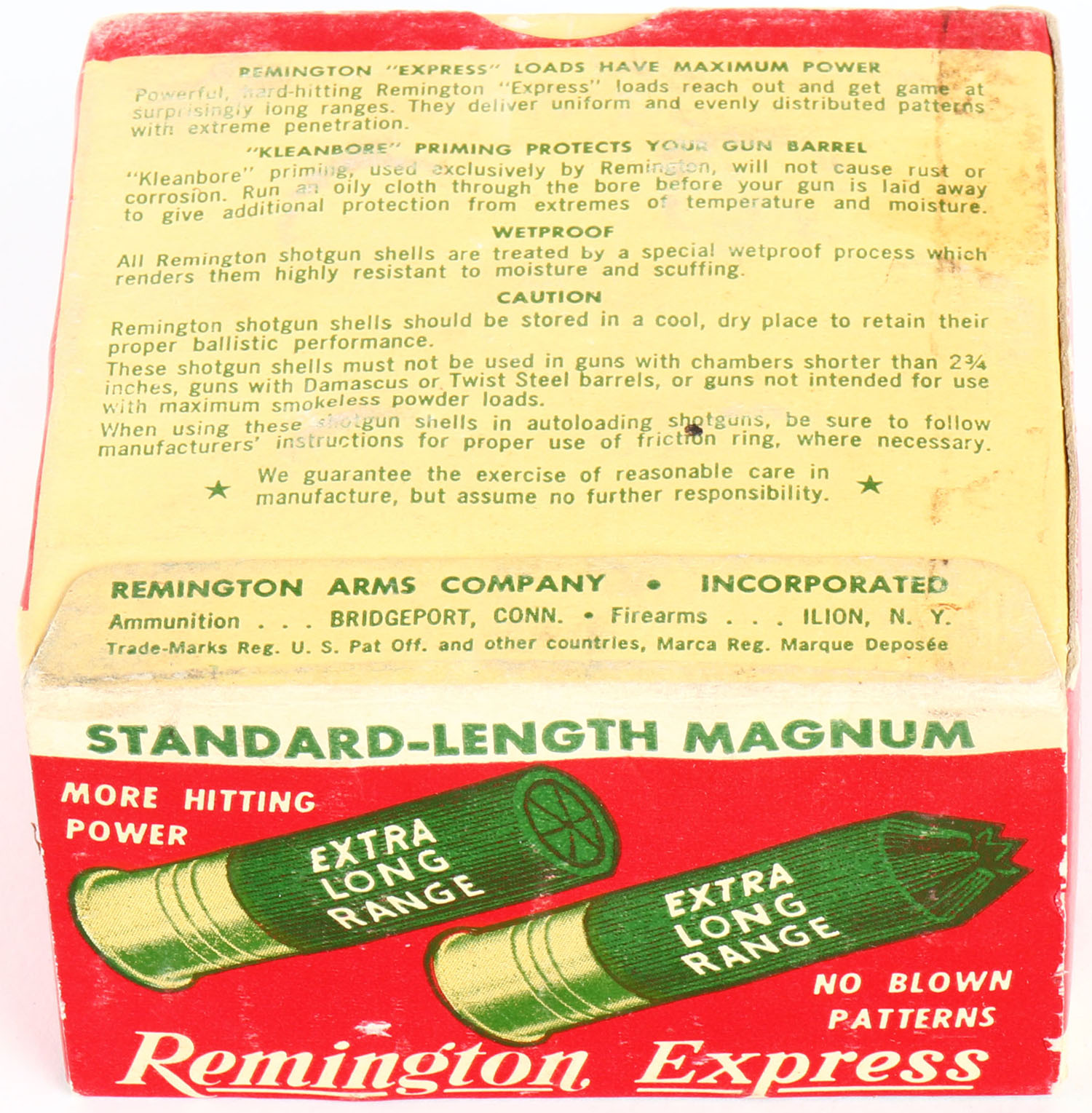 Remington Express, Standard-Length Magnum, 12ga., 2 3/4'', 1pc., Full, shot size 6, box is white, yellow, red and green, box has light edge wear & light soiling with very nice colors, shells are very good. Grade: Very Good ++ - Value: 10 to 40