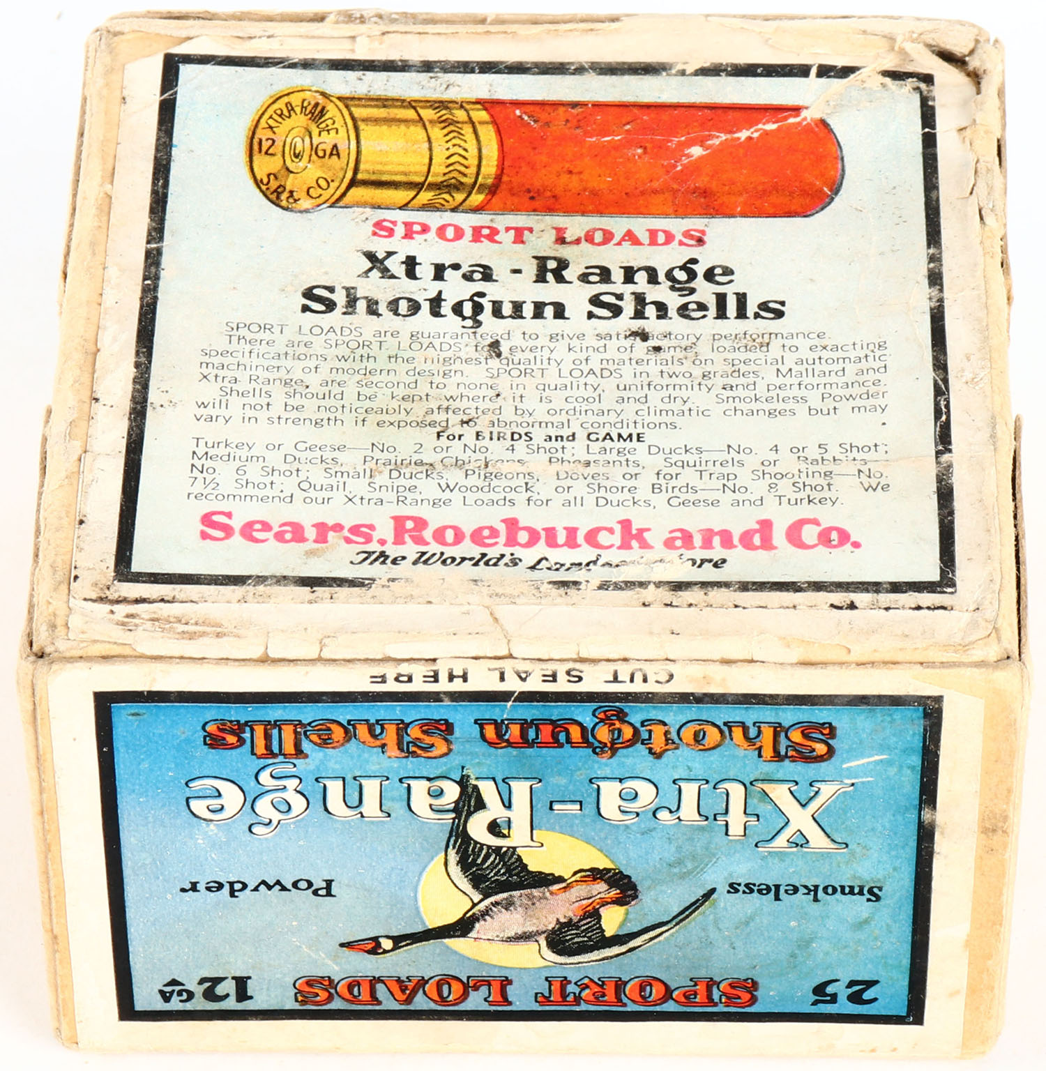 Sears Roebuck & Co., Sports Loads, XTRA-RANGE, 12ga., 2pc., Empty, shot size 2 Ch, buff box with multi colored label that pictures a Goose flying with a yellow moon in background, box has light soiling, light edge wear & light scuffing with very nice colors. Grade: Very Good ++ - Value: 60 to 200