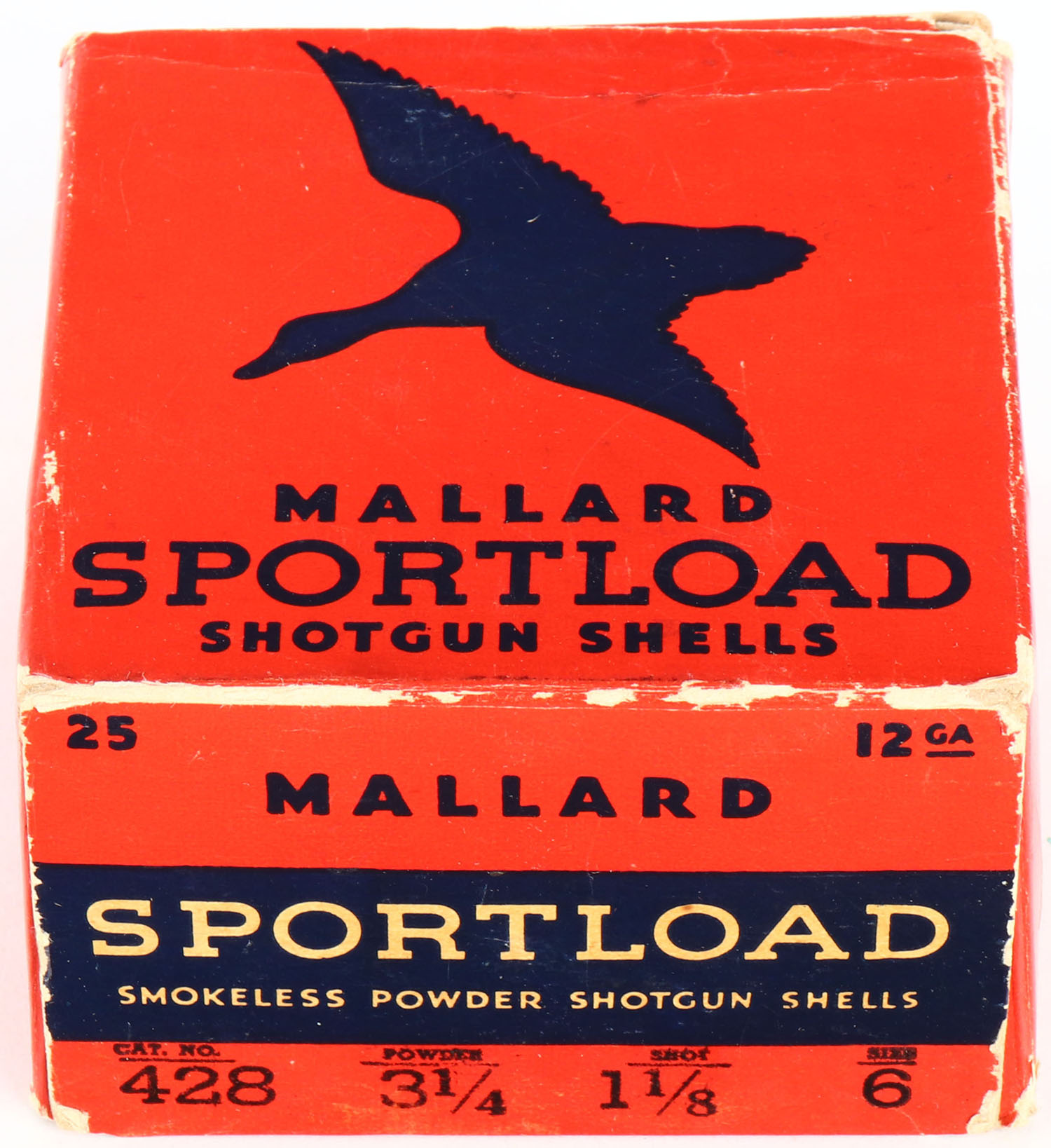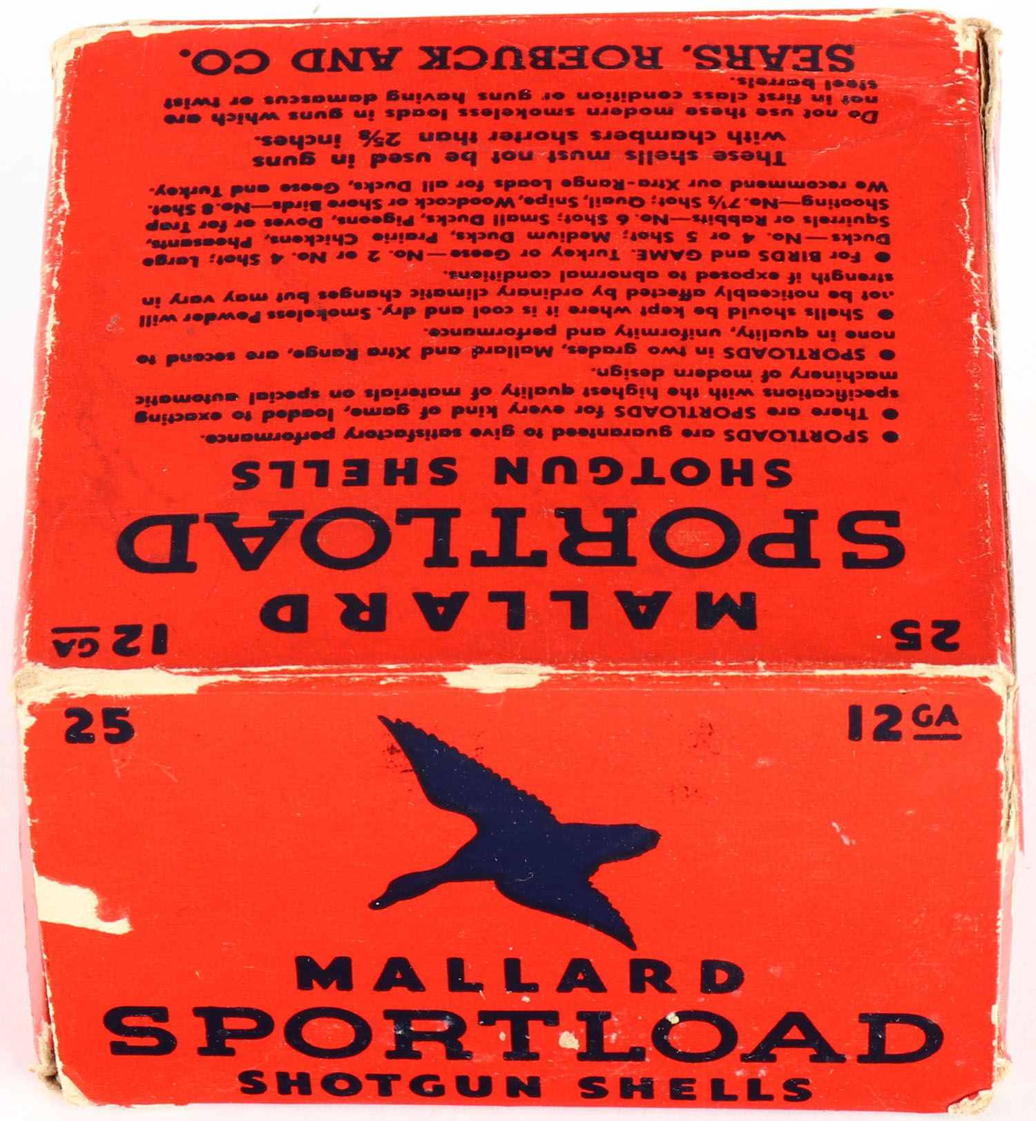 Sears, Sportload MALLARD, 12ga., 1pc., Partial 17rds, shot size 5 ch, red & blue box that pictures a Mallard in flight, box has disconnected inside flap & torn inside flap, tape repair & light edge wear with very nice colors, shells are very good. Grade: Very Good ++ - Value: 20 to 80