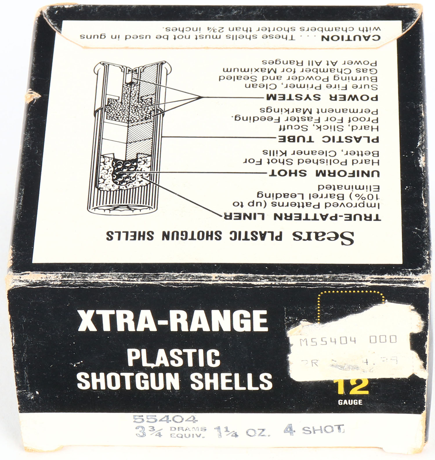 Sears, Xtra-Range, 12ga., 1pc., Full, Shot Size 4, box has light edge wear & very nice colors, shells are excellent. Grade: Very Good ++ - Value: 10 to 30