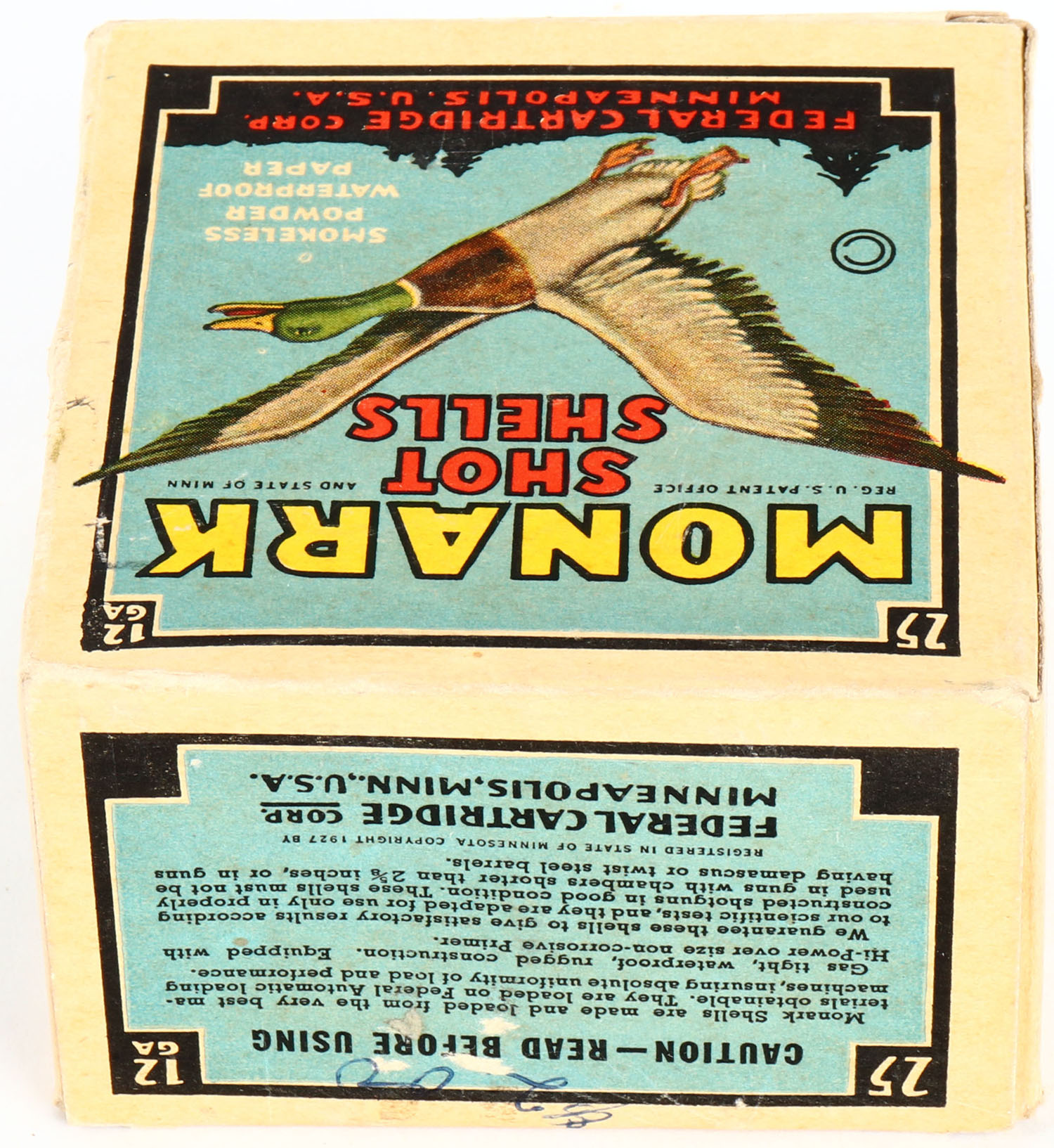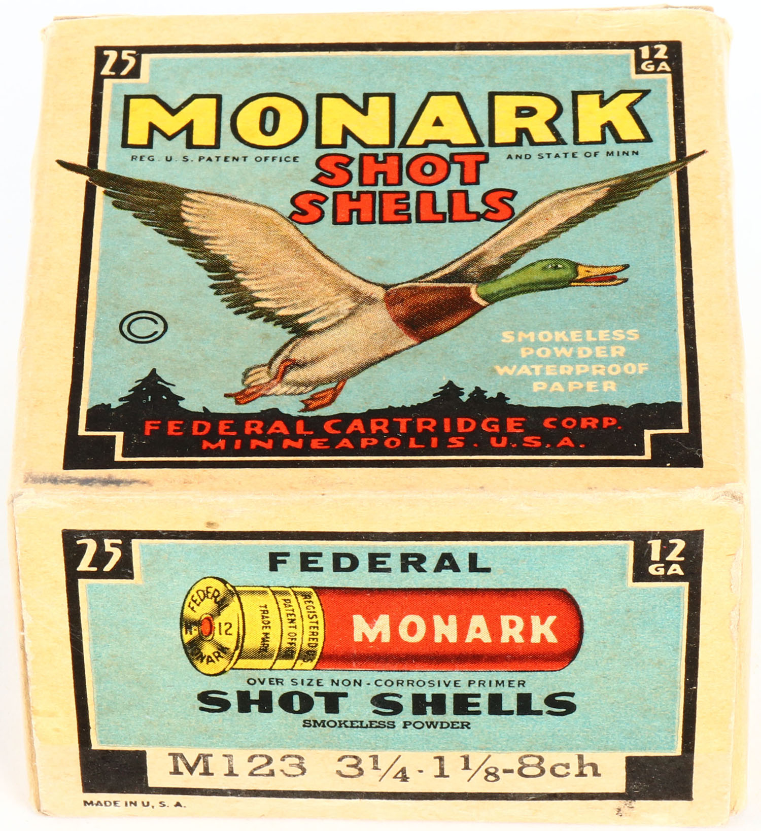 Federal Cart. Co., MONARK, 12ga., 1pc., Full, shot size 8ch, Black border, blue, yellow and red box with flying mallard, box has light edge wear with very nice color, Shells are excellent. Grade: Very Good ++ - Value: 10 to 40
