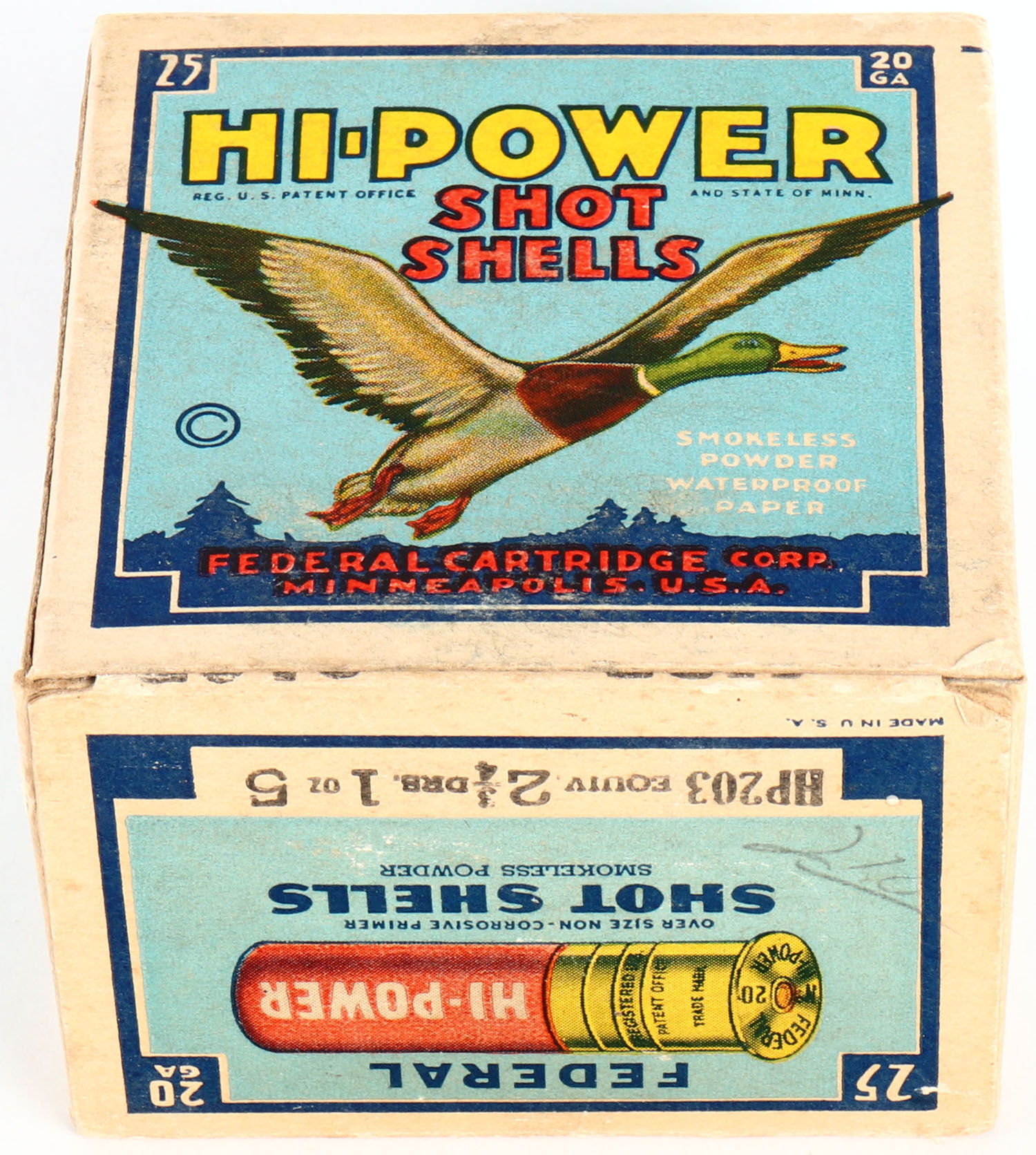 Federal Cart. Co., HI-POWER, 20ga., 1pc., Full, shot size 5, Blue border, blue, yellow and red box with flying mallard, box has light soiling with very nice colors, Shells are excellent. Grade: Very Good ++ - Value: 10 to 50