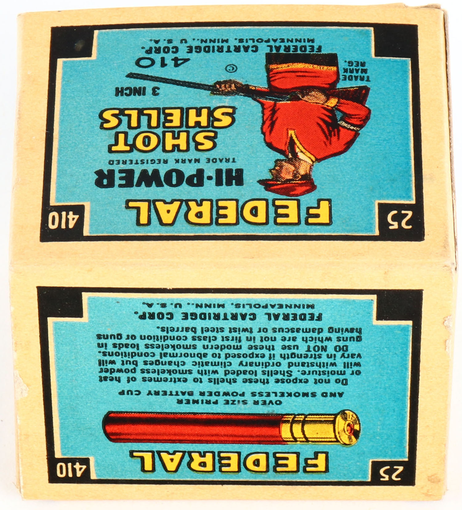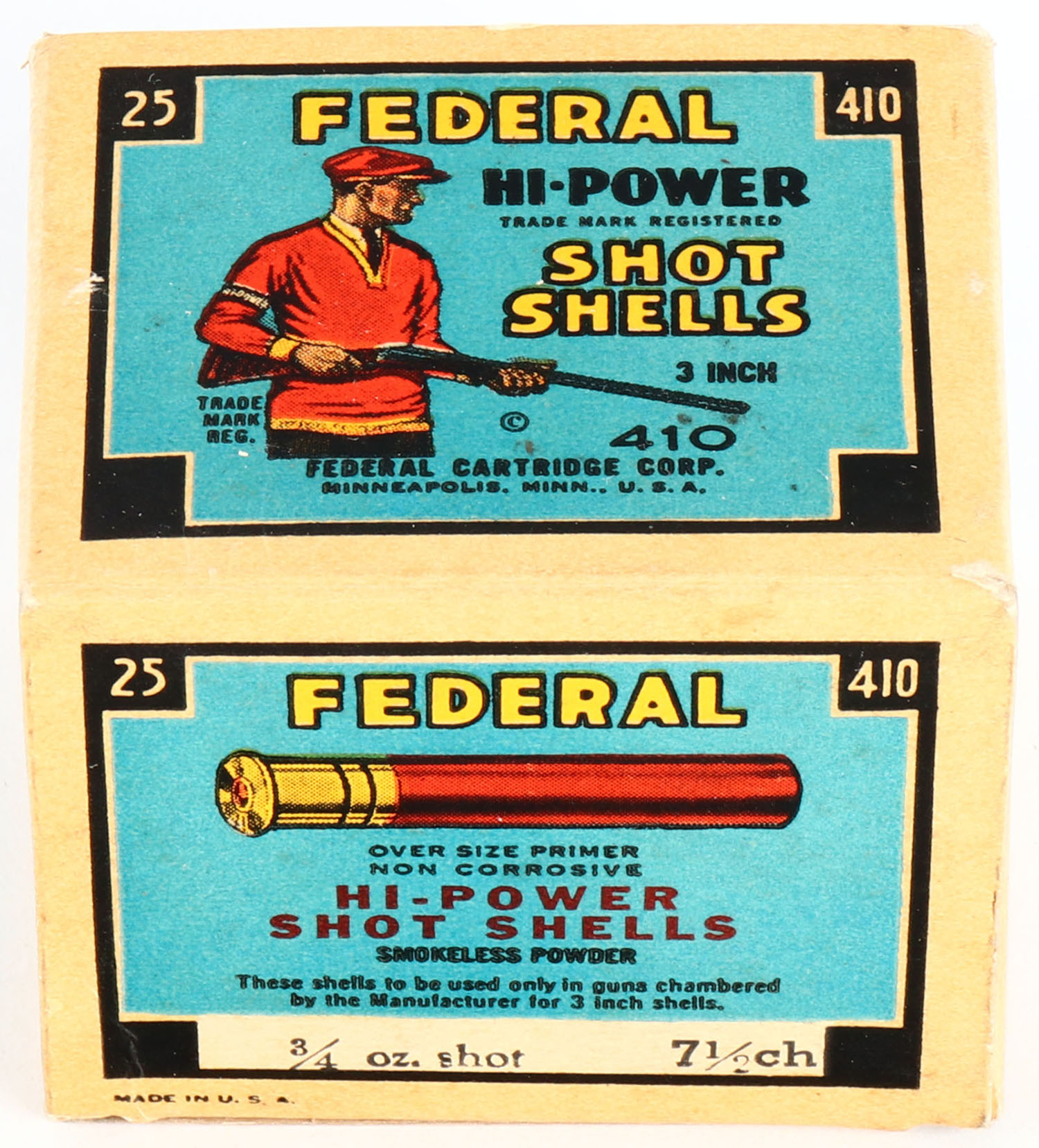 Federal Cart. Co., HI-POWER with Insert, 410ga., 3'', 1pc., Full, shot size 7 1/2, Black border, blue, yellow and red box with Trap Shooter, box has light soiling with great colors, Shells are excellent. Grade: Excellent - Value: 20 to 80