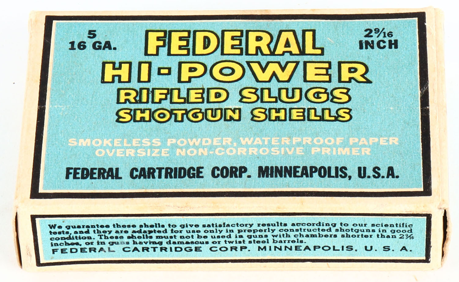 Federal Cart. Co., HI-POWER, 16ga., 2 9/16'', 1pc., Full, shot size Rifled Slugs, Black border, blue, yellow and black box, box has light soiling with very nice colors, Shells are excellent. Grade: Very Good ++ - Value: 6 to 20