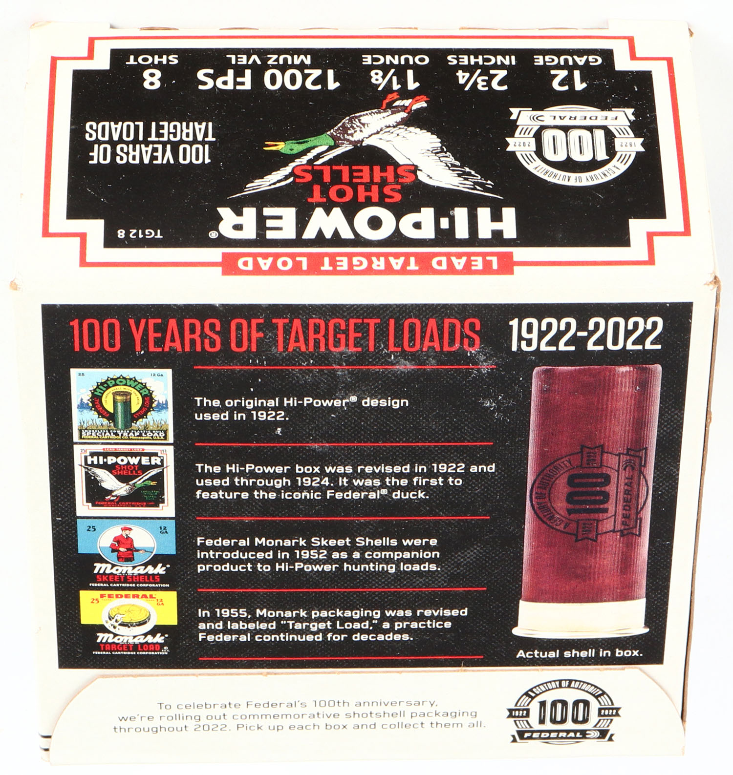 Federal Cart. Co., HI-POWER 100 Year Anniversary, 12ga., 2 3/4'', 1pc., Full, shot size 8, black, white and red box with Flying Mallard, box very solid with Minty color, box shows earlier boxes & when they were introduced also tells little story about Federal, shells are Minty. Grade: Excellent ++ - Value: 20 to 80