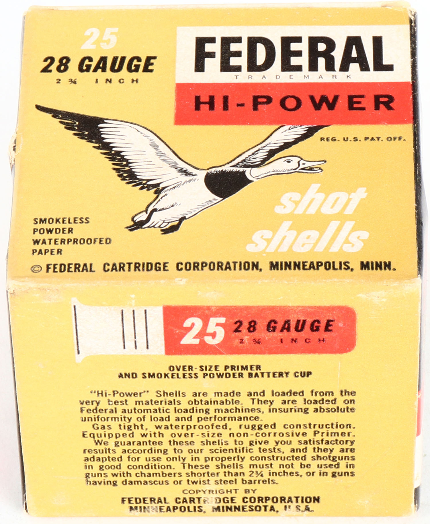 Federal, Hi-Power, 28ga., 2 3/4'', 1pc., Full, shot size 6 Magnum Load, multi-colored box, box is solid, shells are excellent. Grade: Very Good ++ - Value: 10 to 30