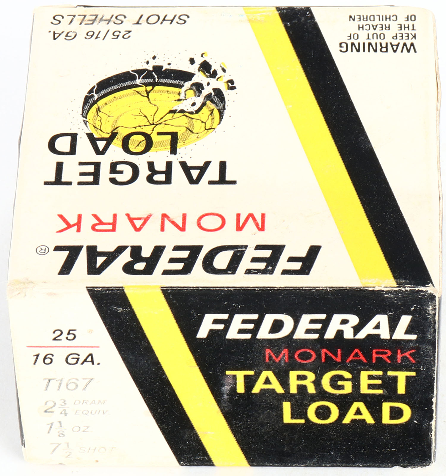 Federal, Monark, 16ga., 1pc., Full, shot size 7 1/2 Target Load, multi-colored box, box is solid, shells are excellent. Grade: Very Good ++ - Value: 10 to 30