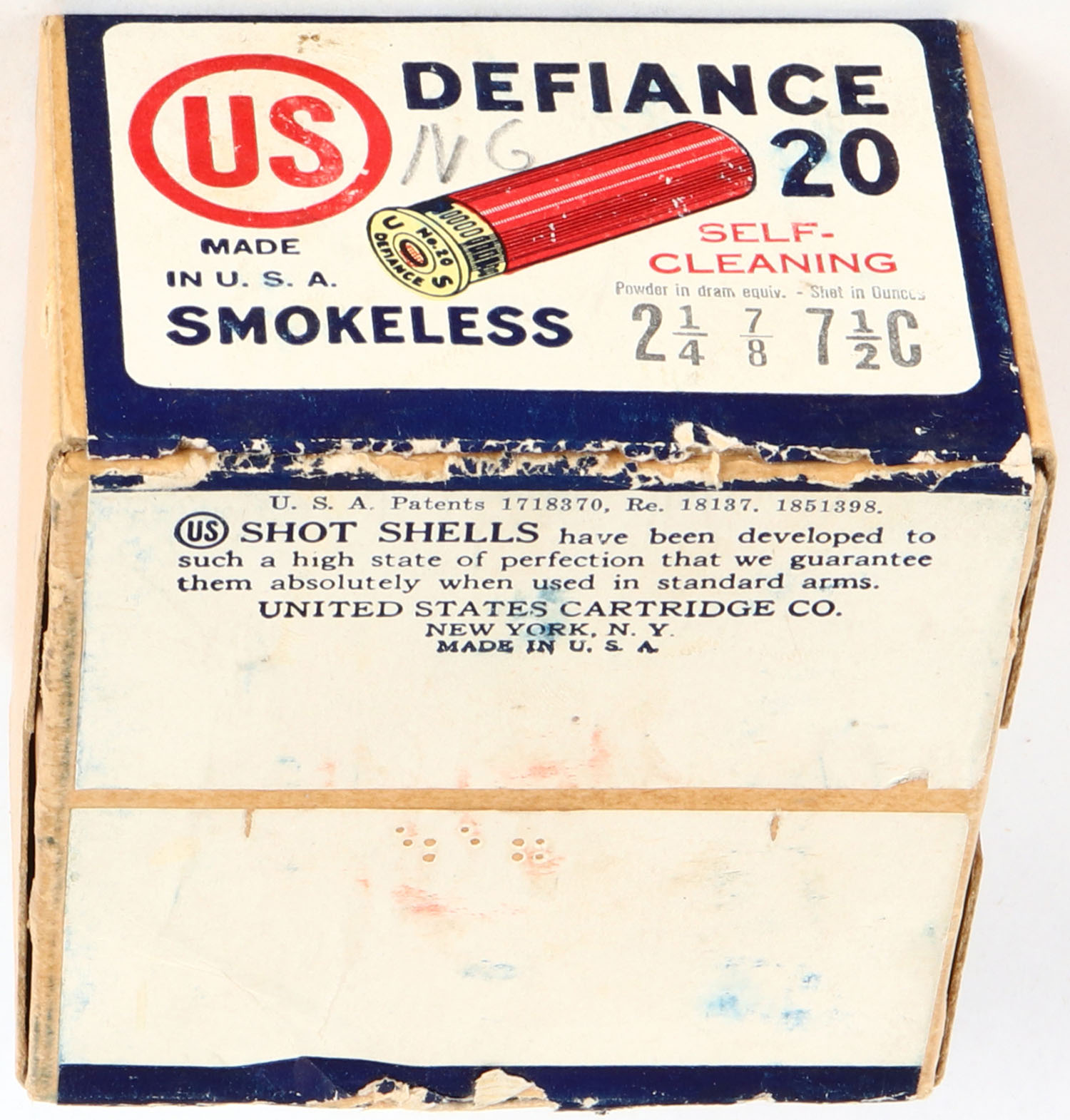 United States Cart. Co., New York, NY, DEFIANCE, 12ga., 2pc., Full, shot size 7 1/2 C, buff box with white, red & blue label, box has light soiling with very nice label. Grade: Excellent - Value: 60 to 250