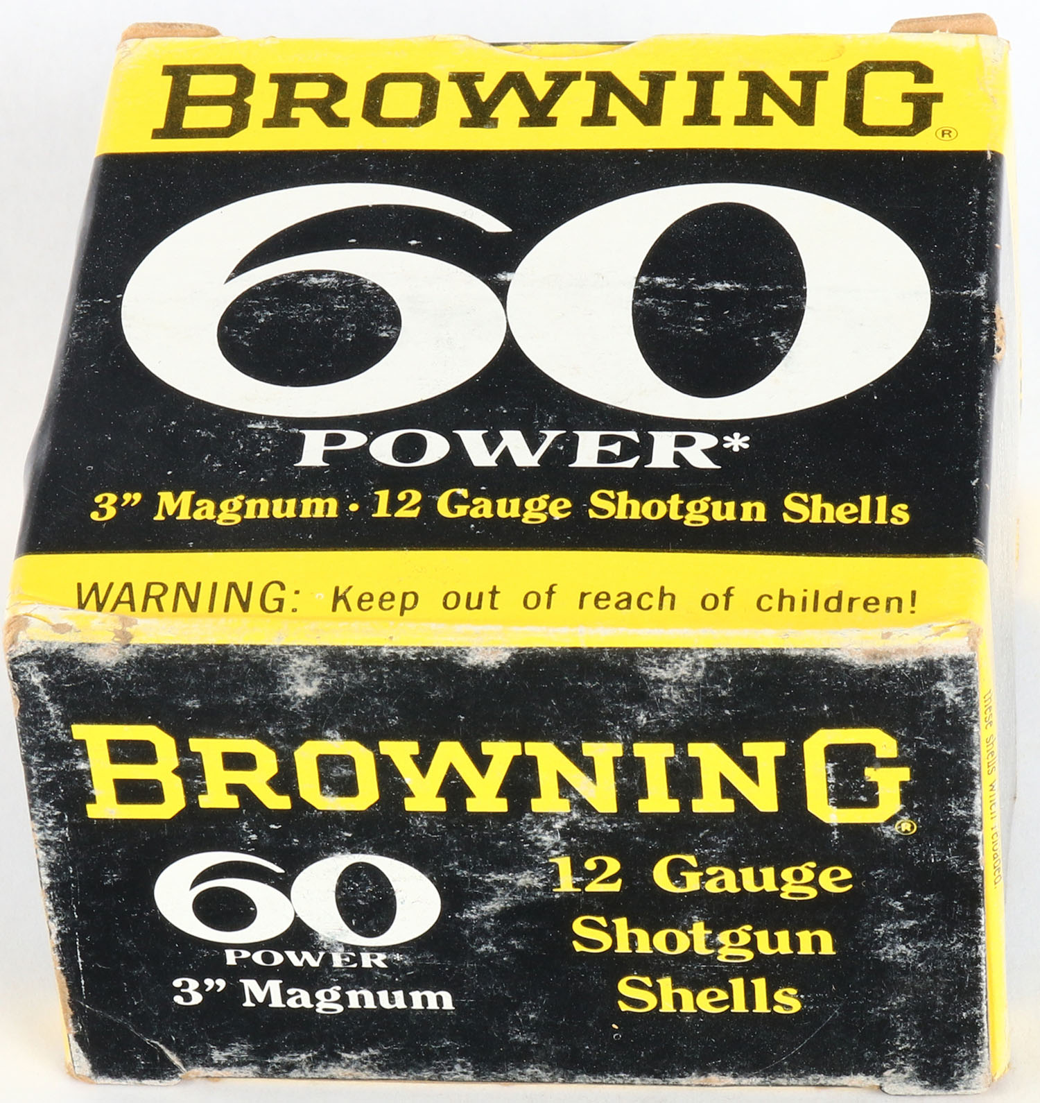 Browning, 60 Power, 12ga., 3'' Magnum, 1pc., Full, shot size 2, black, yellow & white box, box is solid with nice color, shells are excellent. Grade: Very Good ++ - Value: 10 to 40