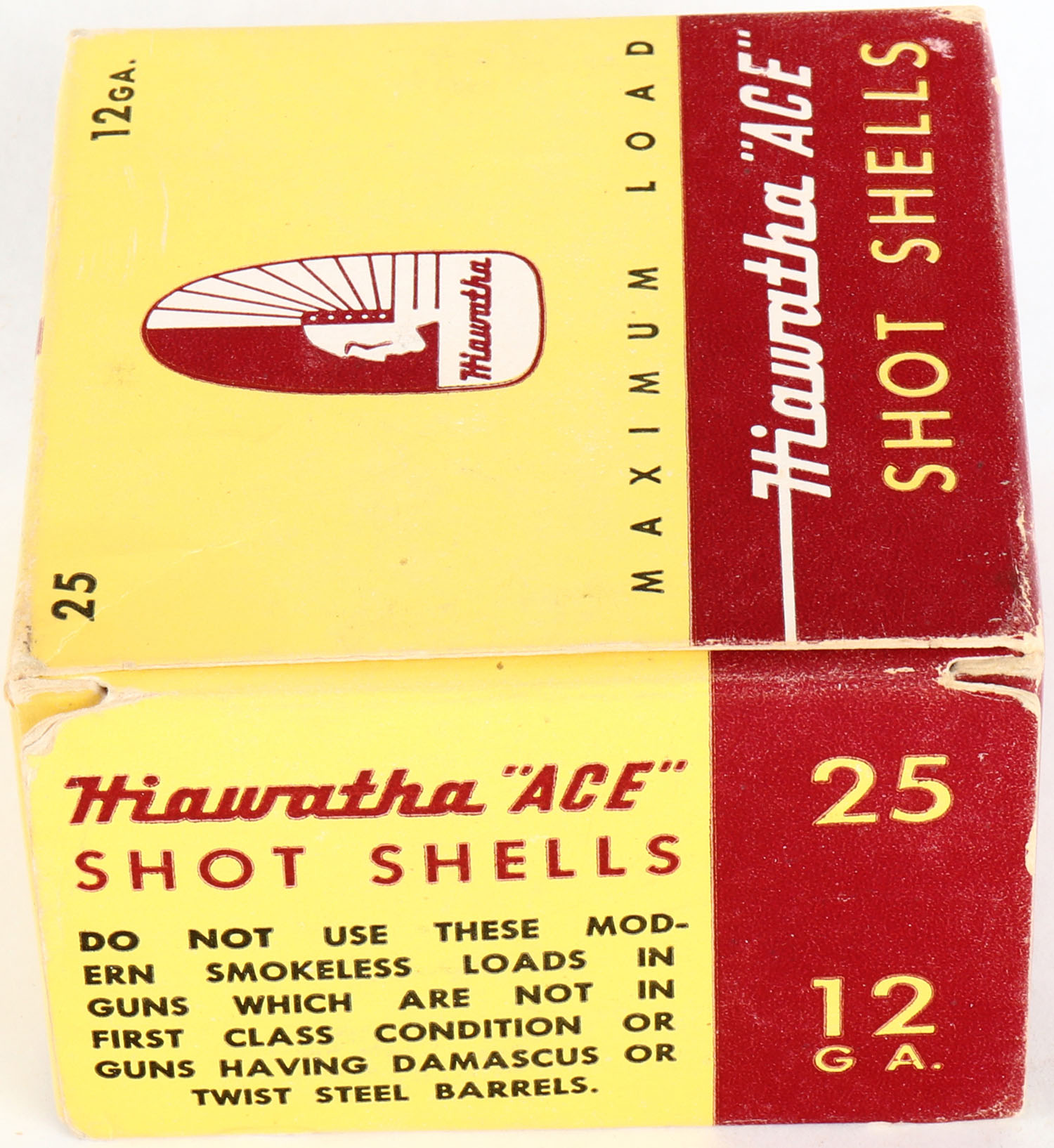 Gambles, Hiawatha ACE, 12ga., 1pc., Partial 10rds., shot size 6, yellow, maroon & white box, box is solid with very nice color, shells are excellent. Grade: Very Good ++ - Value: 6 to 30