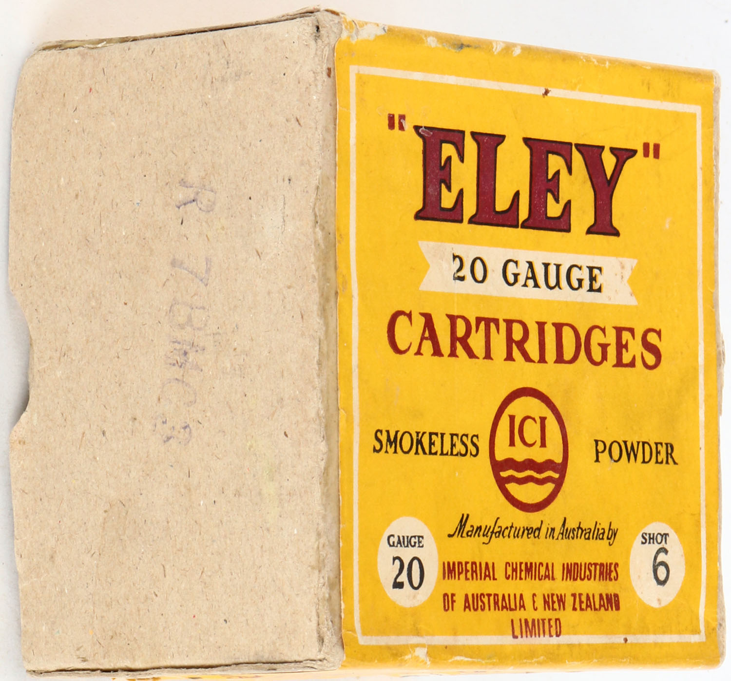 Eley, Cartridges, 20ga., 2pc, Empty, shot size 6, multi-colored box, box is solid with great colors. Grade: Excellent - Value: 10 to 50