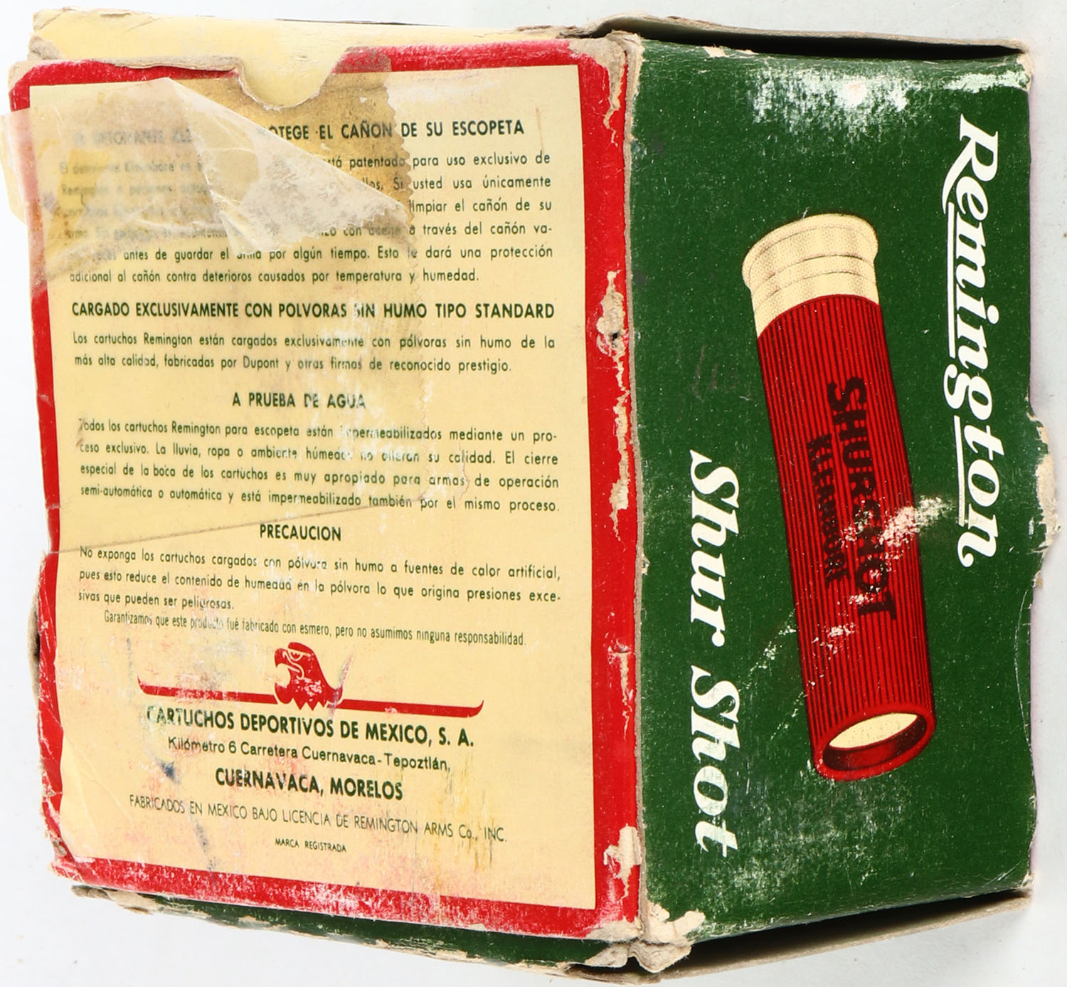 Remington, Shur Shot loaded in Mexico, 20ga., 1pc., Full, shot size BB multi-colored box, box shows wear, Shells are excellent. Grade: Very Good ++ - Value: 10 to 20