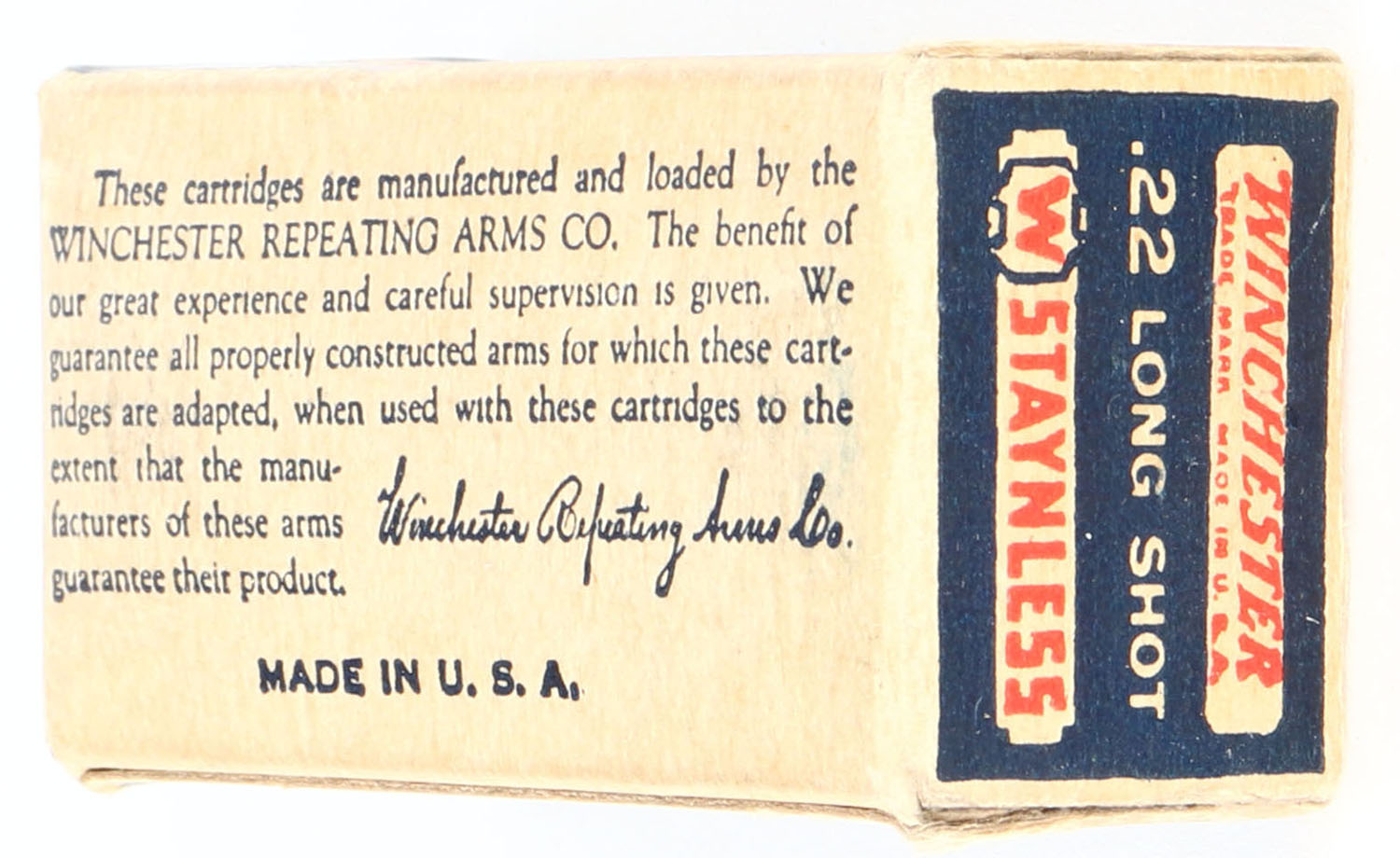 Winchester, Staynless, .22 Long Shot, RHWeb: WRA-12B L-3Bc, Partial 20rds., 1pc. Blue white & red box, box is solid with very good to excellent color, minor age soiling & corner wear, very minor edge wear, end flaps are solid, ammo is excellent. Grade: Excellent - Value: 40 to 120