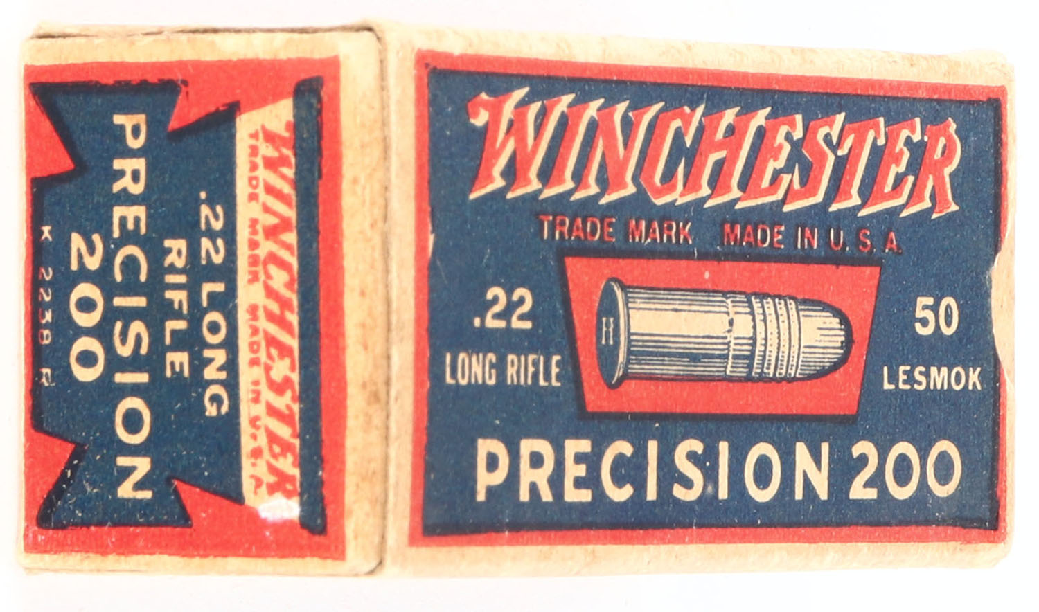 Winchester, .22 Long Rifle, Staynless Lead Greased, RHWeb: WRA-14A LR-1a, Army Lot 206, Partial 48rds., 1pc. Yellow blue & red box, box is solid with excellent color, minor age soiling, some corner wear, minor edge wear, end flaps are solid, ammo is excellent. Grade: Very Good ++ - Value: 40 to 120