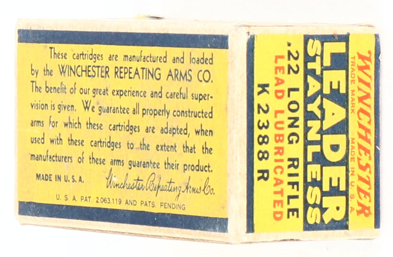 Winchester, Leader Staynless, .22 Long Rifle, RHWeb: WRA-55 LR-1a, Full, 1pc. Yellow blue & red box, box is solid with very good color, some age soiling & corner wear, very minor edge wear, end flaps are solid, ammo is very good. Grade: Excellent - Value: 20 to 60