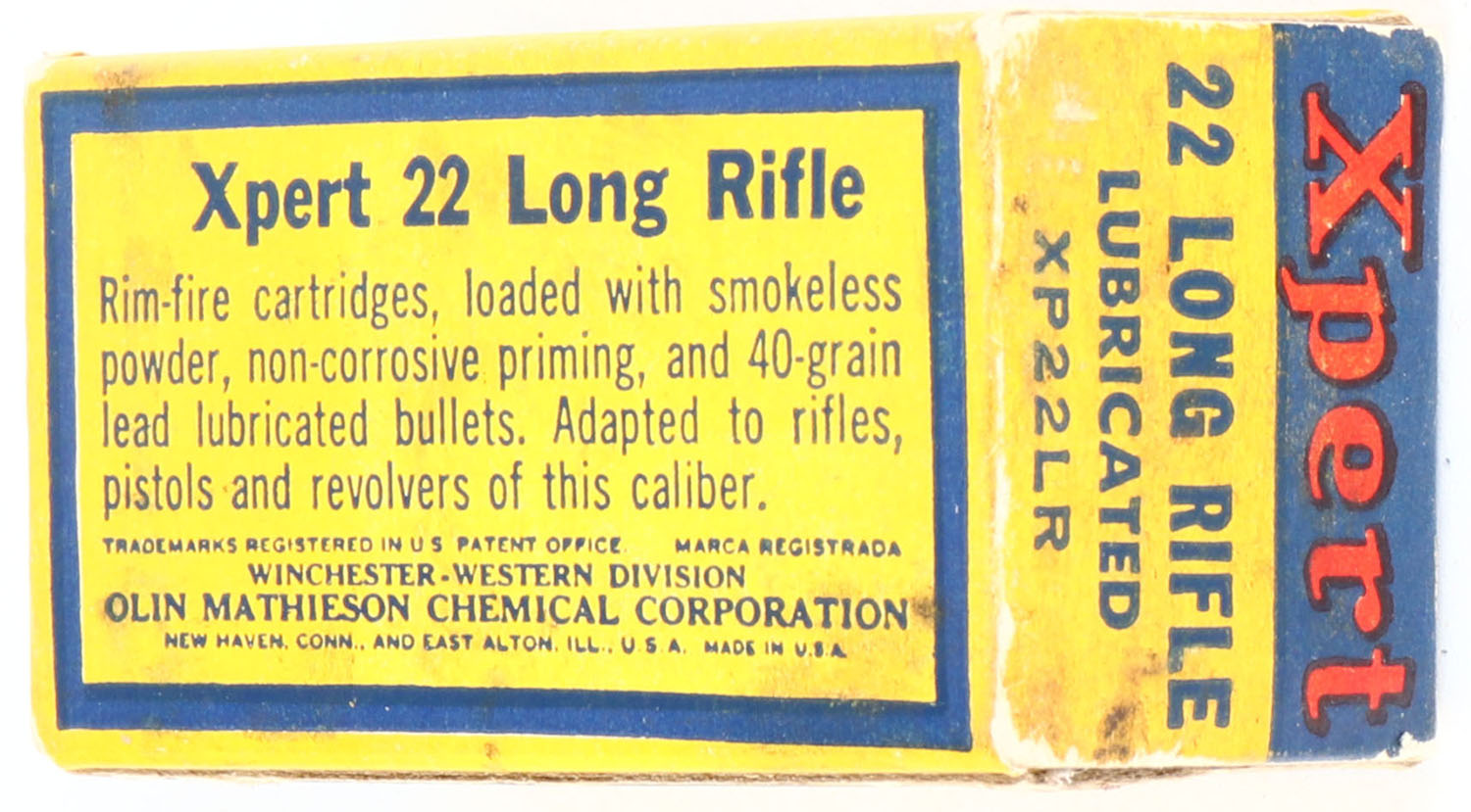 Western, Xpert, .22 Long Rifle, Lubricated, RHWeb: WCC-52 LR-1k, Full, 1pc. Yellow blue & red box, box is solid with excellent color, very minor corner wear, edges are mostly crisp, end flaps are solid, ammo is excellent. Grade: Excellent + - Value: 6 to 30
