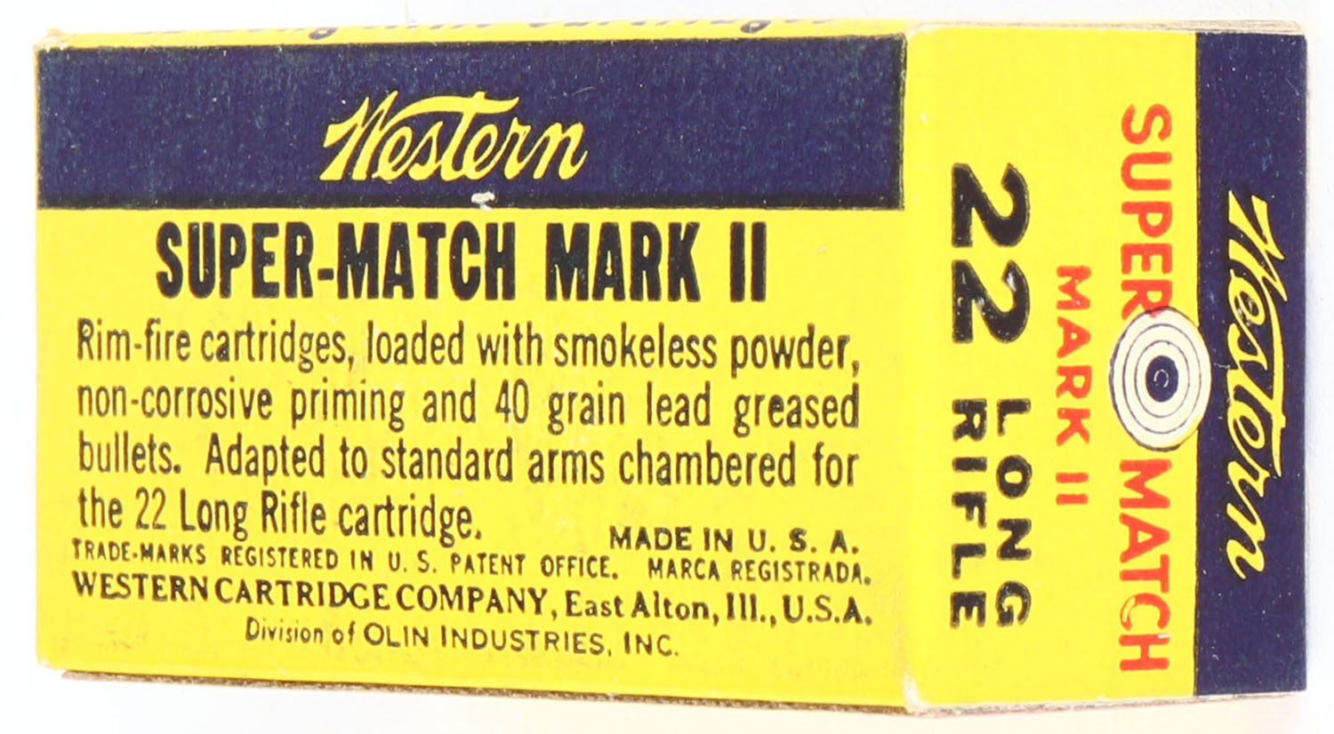 Western, Super Match Mark II, .22 Long Rifle, RHWeb: WCC-51.2 LR-3g, Full, 1pc. Yellow blue & red box, box is MINT with minty color, corners are sharp, edges are crisp, end flaps are solid, ammo is excellent to minty. Grade: MINT - Value: 20 to 60