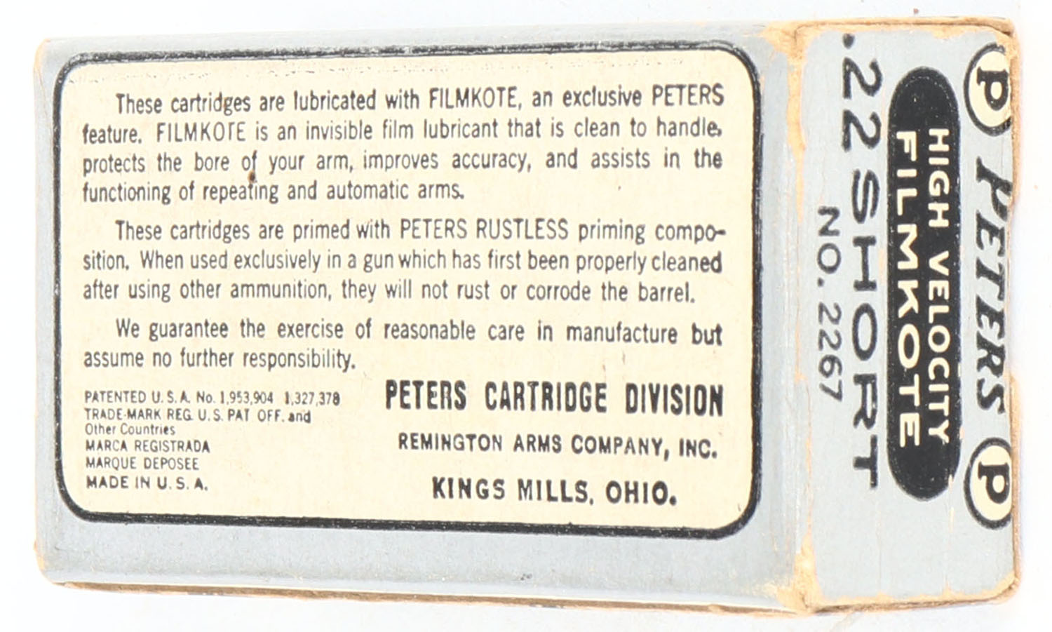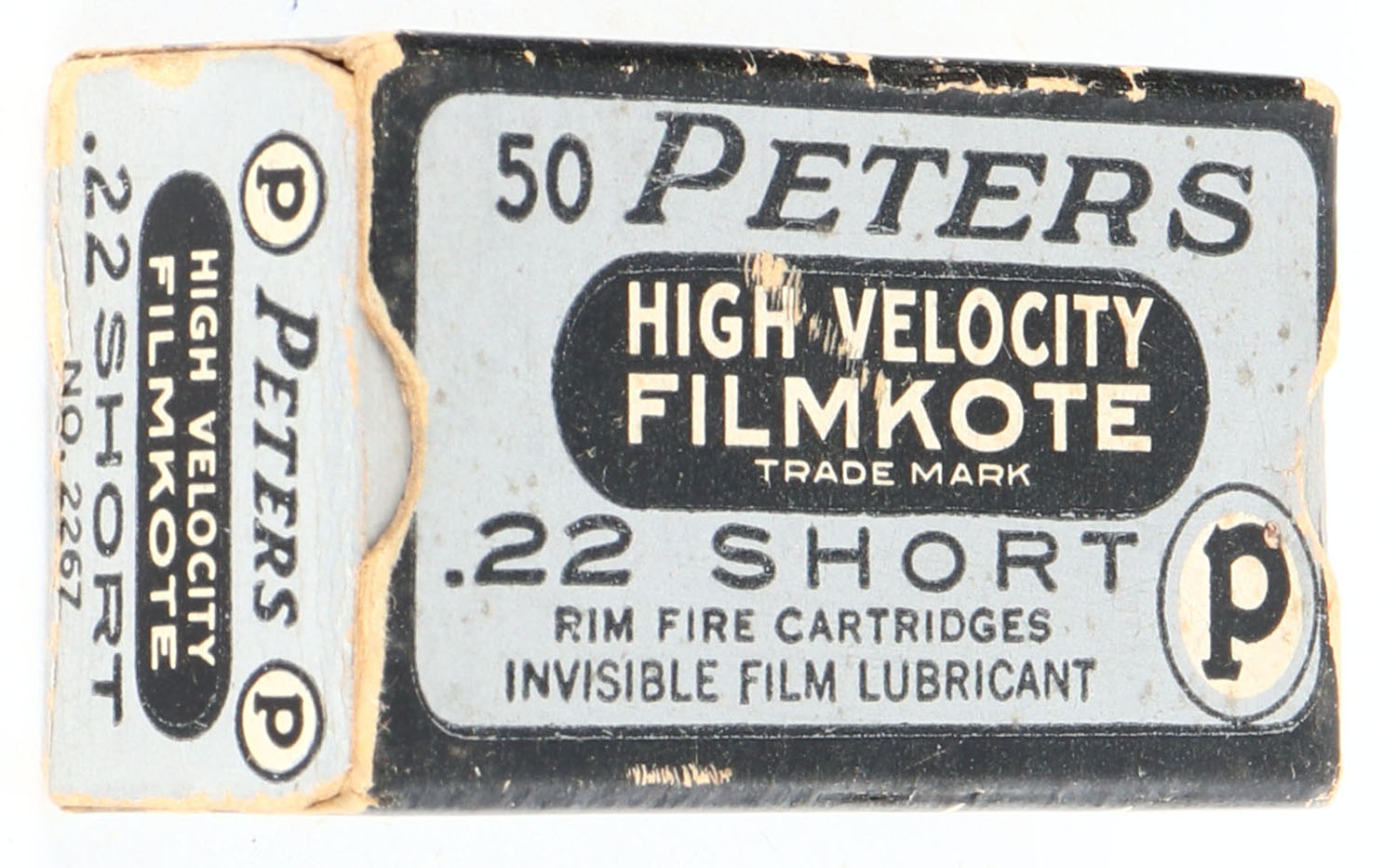 Peters, High Velocity Filmkote, .22 Short, RHWeb: PCC-13 S-1g, Full, 1pc. Silver & black box, box is solid with excellent color, very minor age soiling & shelf wear, minor edge & corner wear, end flaps are solid, ammo is excellent. Grade: Very Good ++ - Value: 20 to 80