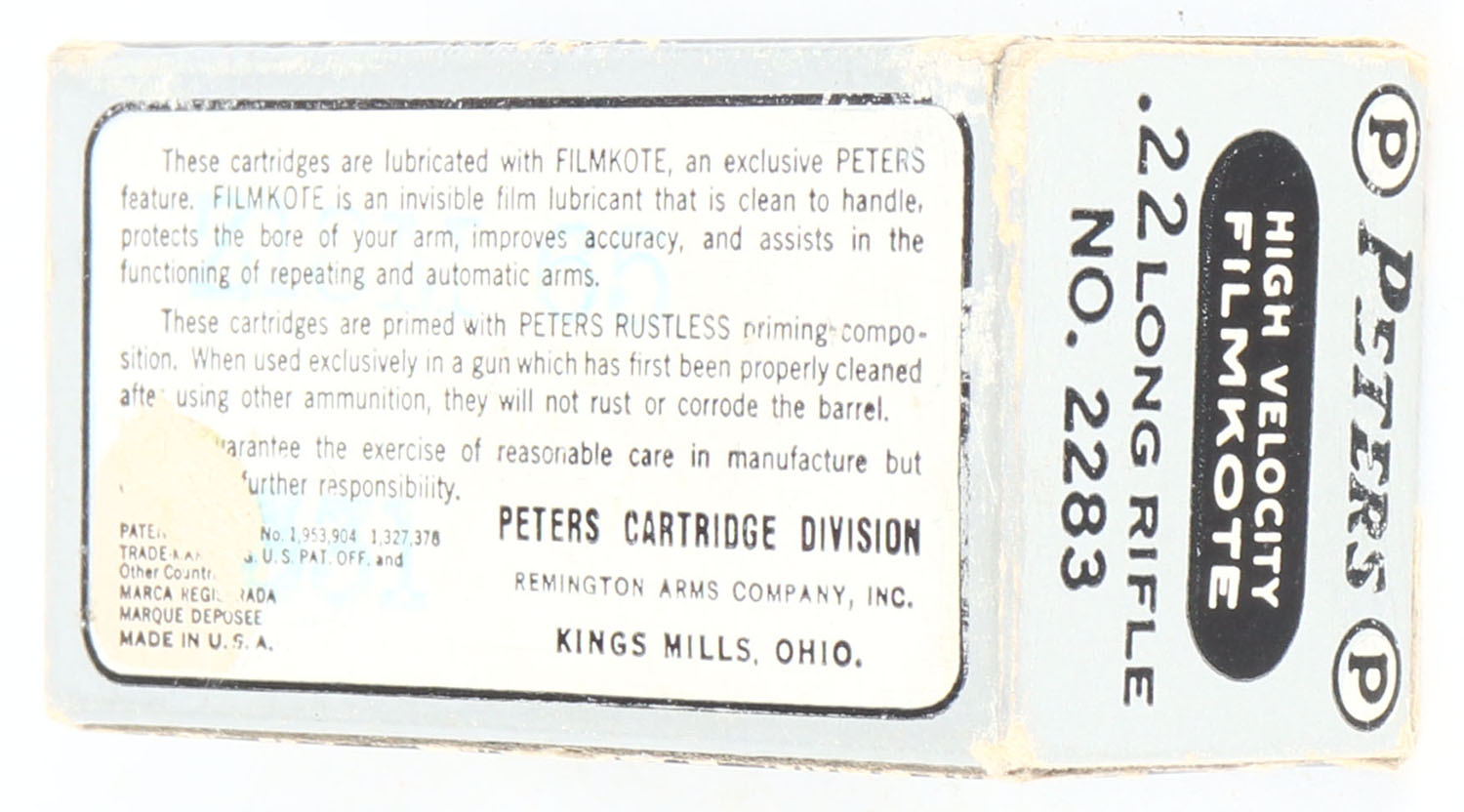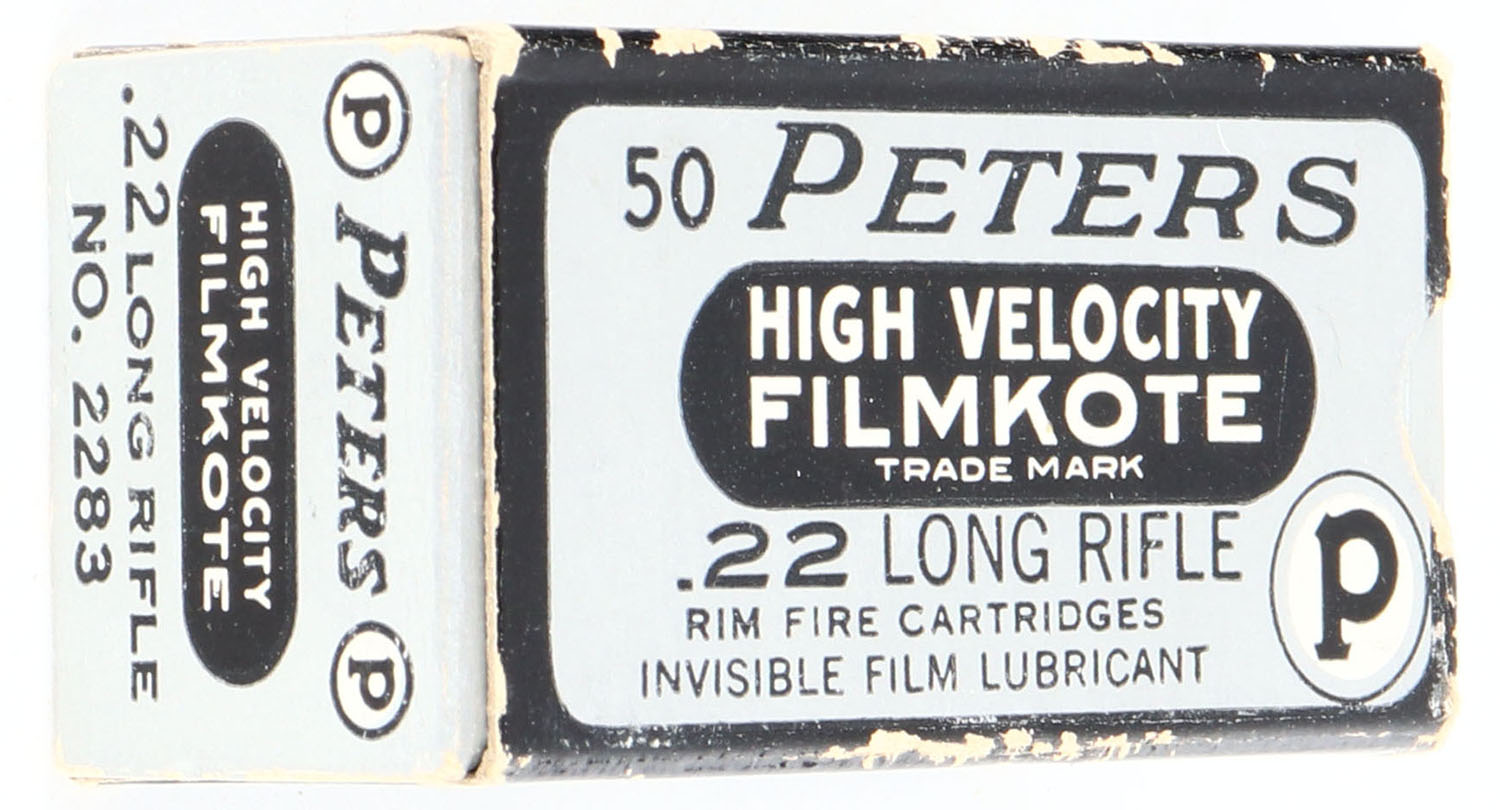Peters, High Velocity Filmkote, .22 Long Rifle, RHWeb: PCC-13 LR-2g, Full, 1pc. Silver & black box, box is solid with excellent color, some edge & corner wear, end flaps are solid, ammo is excellent to minty. Grade: Excellent - Value: 8 to 40