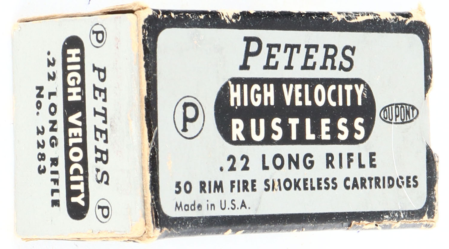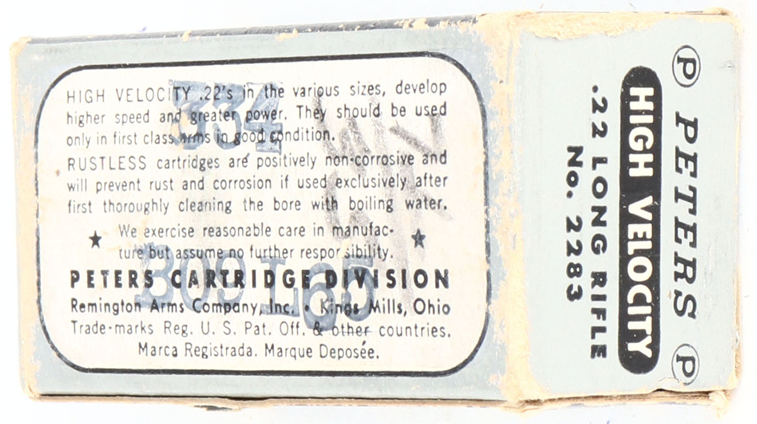 Peters, High Velocity Rustless, .22 Long Rifle, RHWeb: PCC-14 LR-1a, Full, 1pc. Silver black & white box, box is solid with excellent color, some shelf wear, edge & corner wear, end flaps are solid, ammo is excellent. Grade: Very Good ++ - Value: 8 to 40