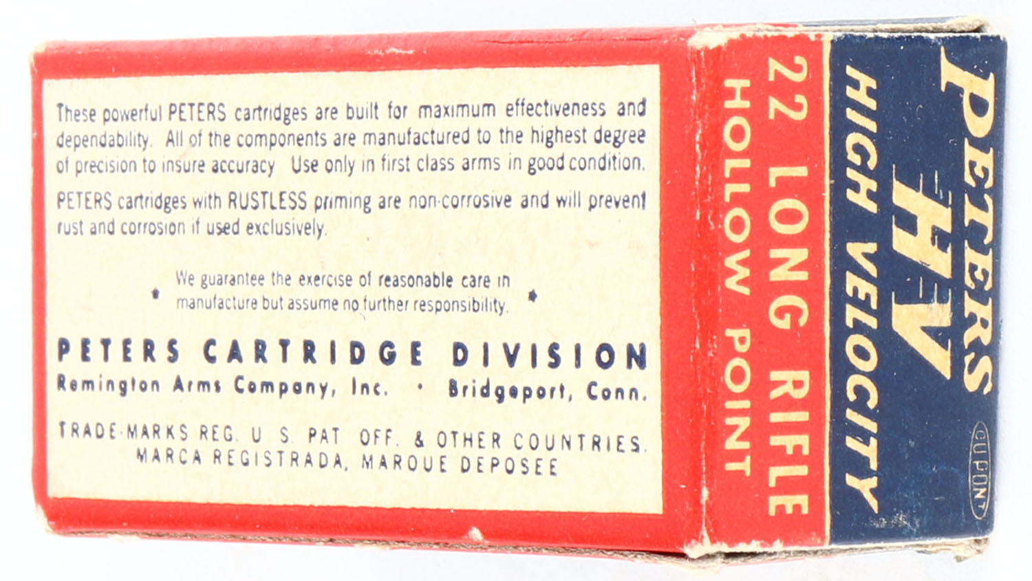 Peters, High Velocity, .22 Long Rifle Hollow Point, RHWeb: PCC-17 LR-3d, Full, 1pc. Blue red & white box, box is solid with excellent color, very minor corner wear, edges are crisp, end flaps are solid, ammo is excellent. Grade: Excellent + - Value: 10 to 40