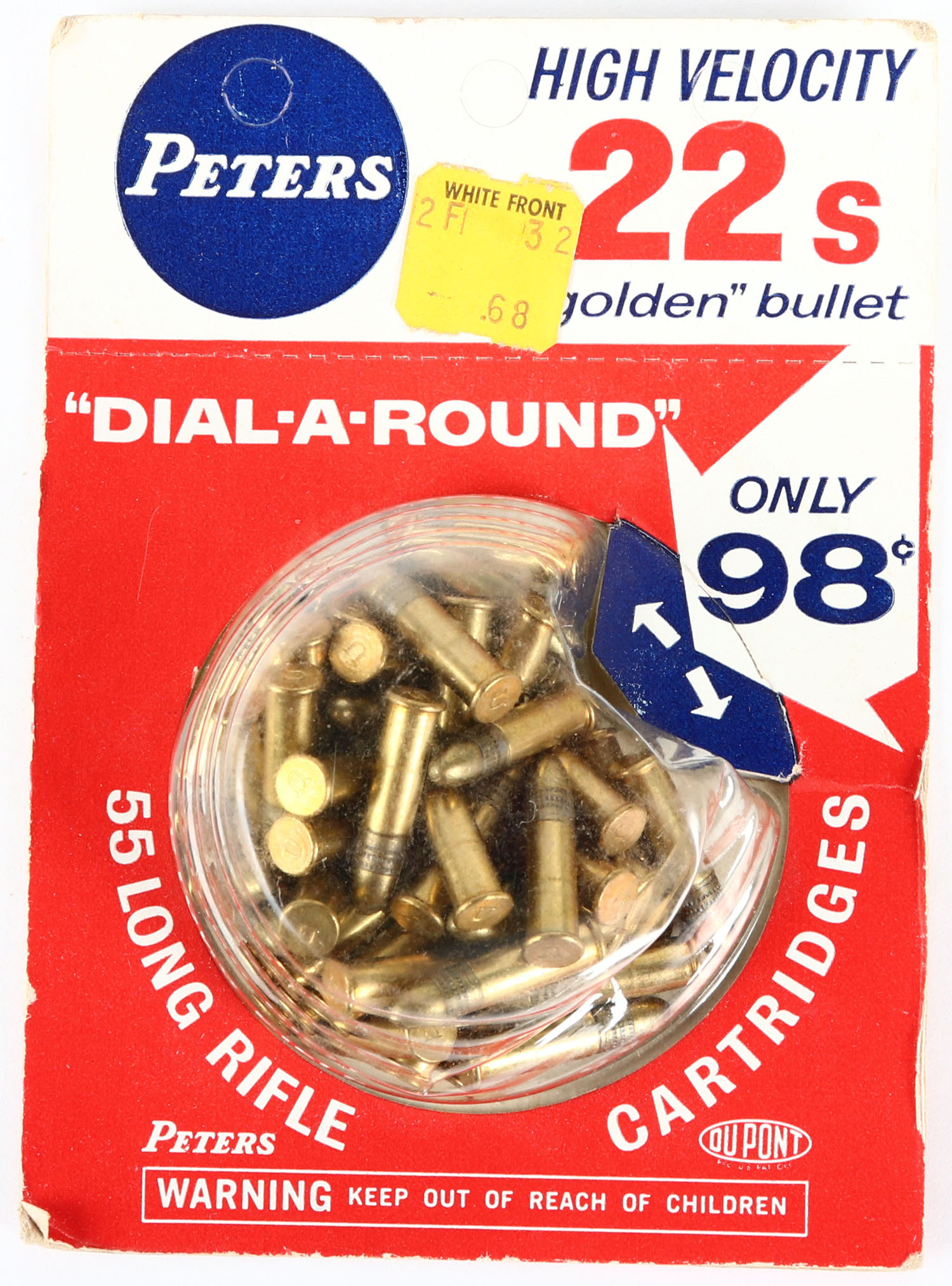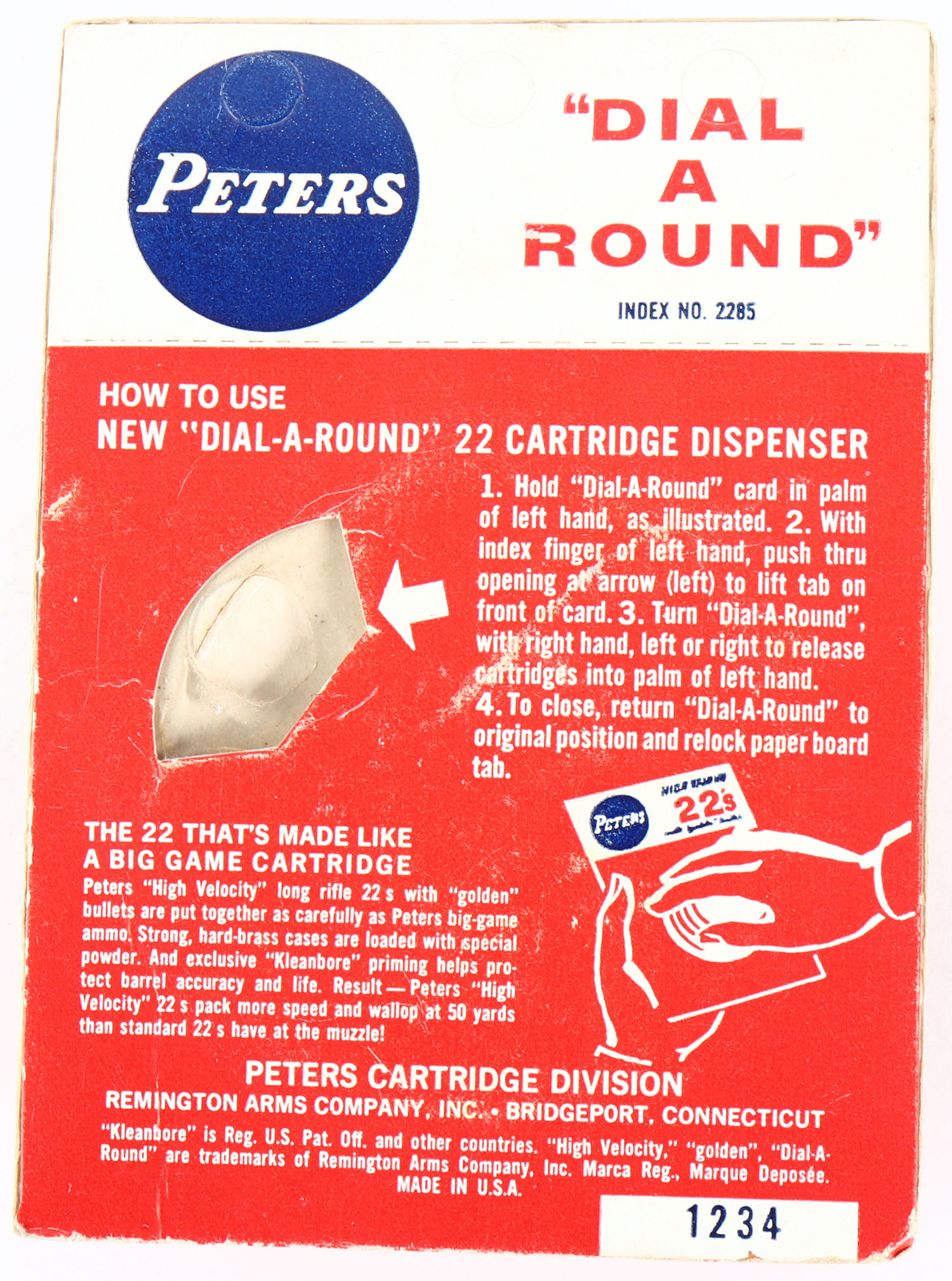 Peters, Dial-A-Round, .22 Long Rifle, High Velocity ''golden'' bullet, RHWeb: PCC FULL & SEALED, 1pc. Red white & blue novelty package, box is solid with excellent color, some edge & corner wear, original price tag on box, ammo is excellent to minty. Grade: Excellent - Value: 20 to 100
