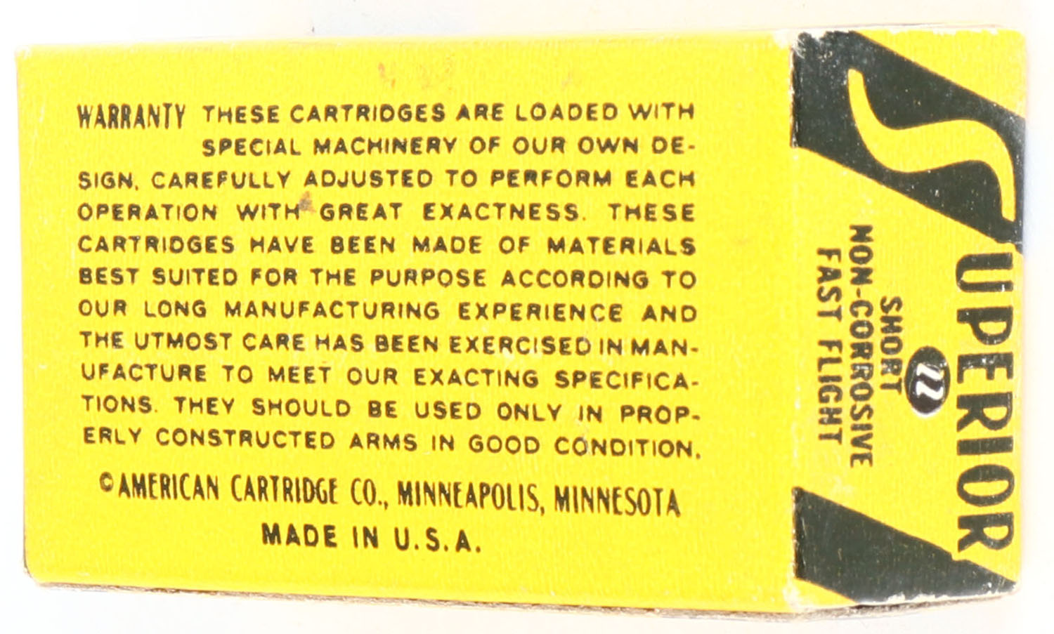 American, Superior Cartridges, .22 Short, Fast Flight, RHWeb: ACC-4 S-1a, Full, 1pc. Yellow & black box with white child warning over-label, box is solid with excellent to minty color, corners are sharp, edges are crisp, end flaps are solid, ammo is very good to excellent. Grade: Excellent ++ - Value: 30 to 90