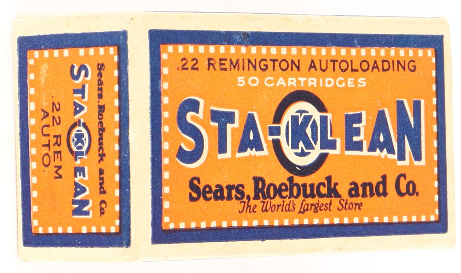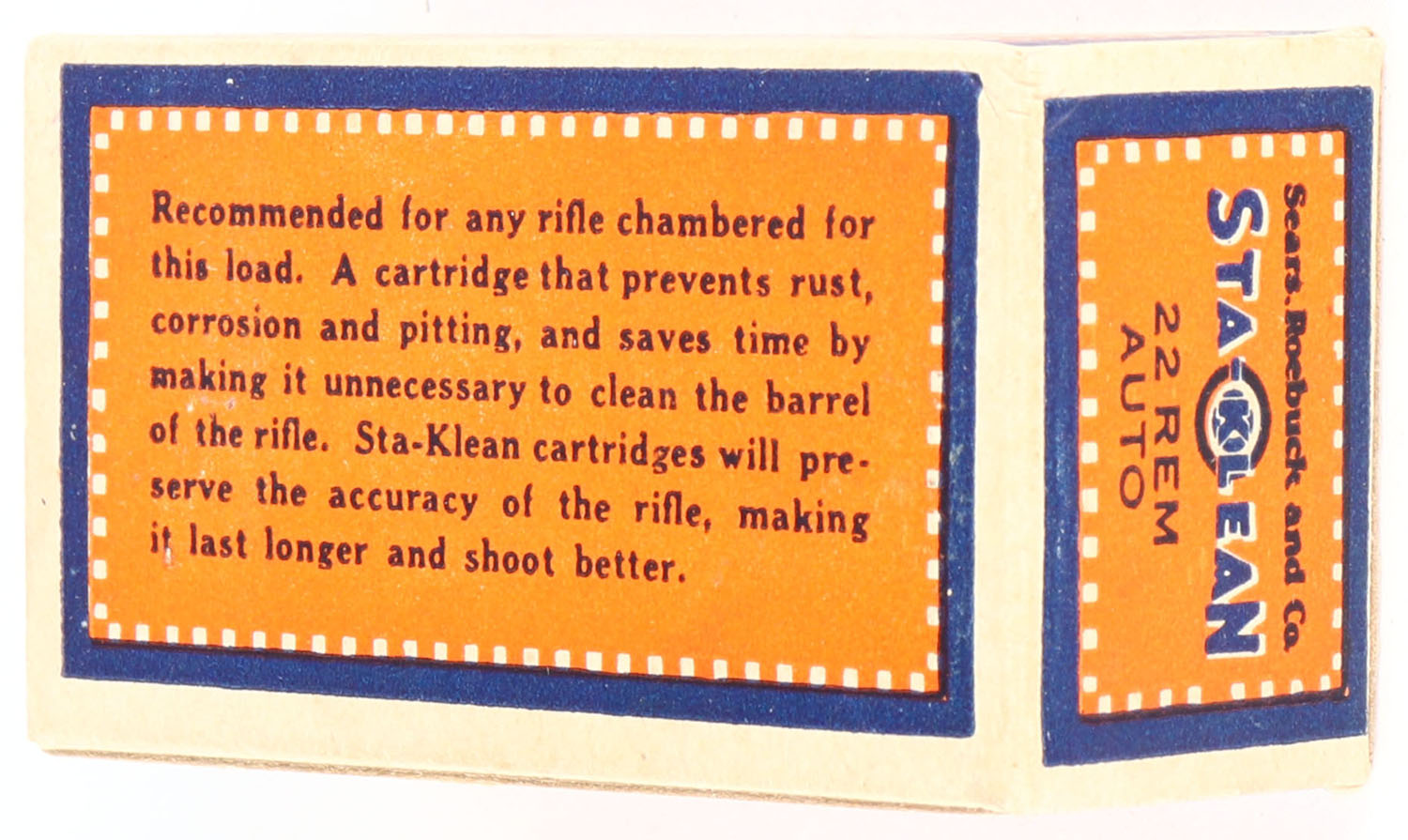 Sears, Sta-Klean, .22 Remington Autoloading, RHWeb: SEARS-2 RA-1, Full, 1pc. Orange blue & buff box, box is near mint with minty color, only has one very minor corner ding on bottom right corner, corners are otherwise sharp, edges are crisp, end flaps are solid, ammo is excellent. Grade: Excellent ++ - Value: 200 to 600