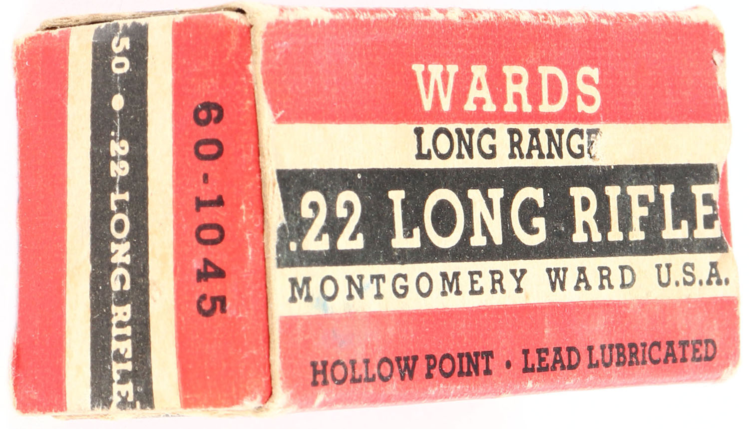 Wards, Long Range Cleanfire, .22 Long Rifle Hollow Point, Lead Lubricated, RHWeb: MW-4B LR-2c, Full, 1pc. Red black & white box, left end flap is torn, box has very good color, age soiling, some corner wear, very minor edge wear, right end flap is solid, ammo is excellent. Grade: Very Good + - Value: 10 to 50