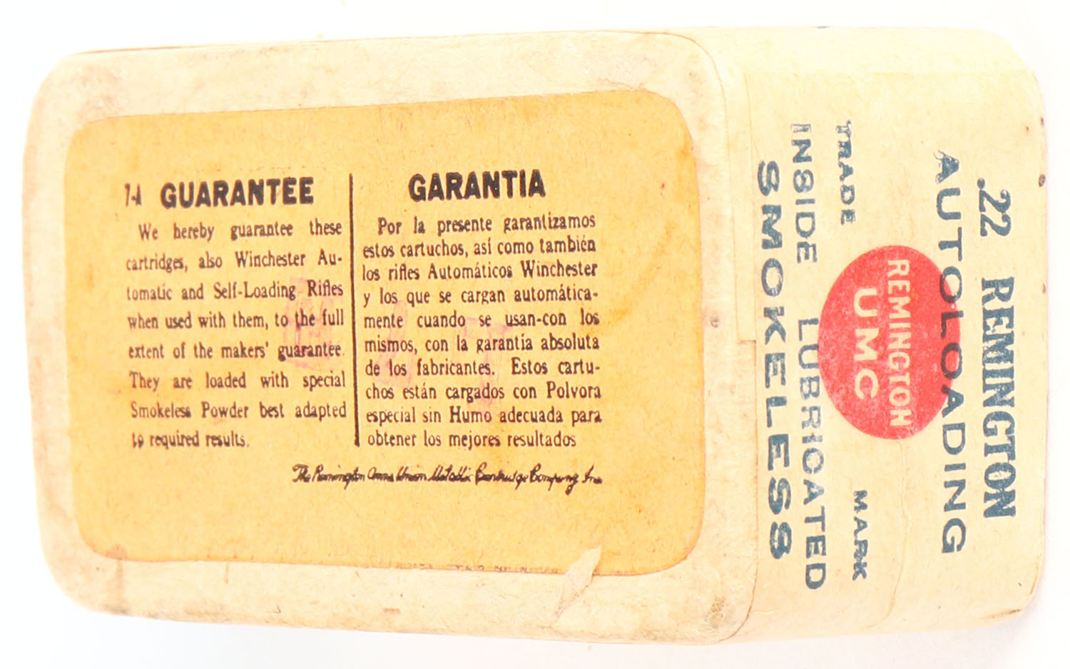 REM-UMC, .22 Remington Autoloading, Smokeless, RHWeb: REM-3 RA-1C, FULL & SEALED, 2pc. Buff box with buff top & side sealing labels, box is solid with very good to excellent color, some age soiling, minor edge & corner wear, labels are intact. Grade: Excellent - Value: 100 to 400