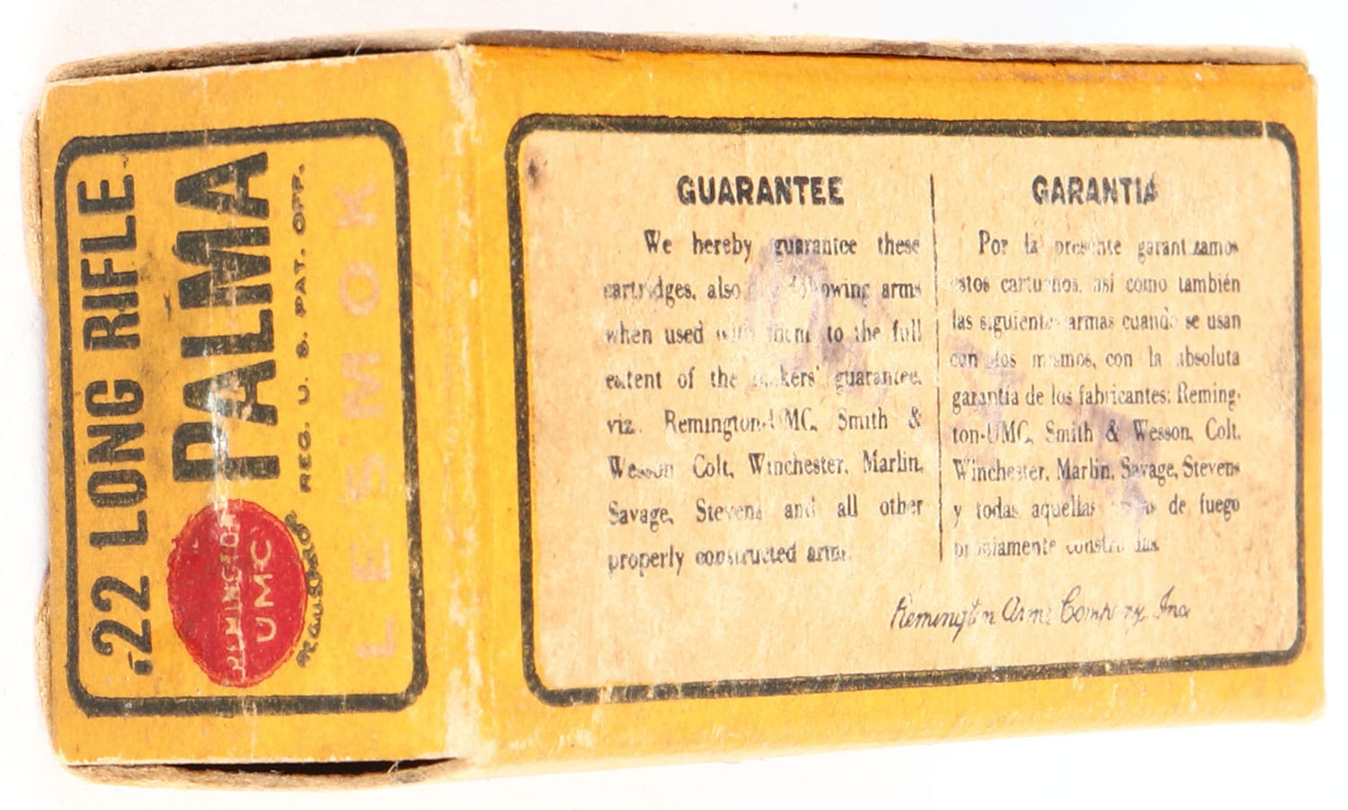 REM-UMC, Palma, .22 Long Rifle, RHWeb: REM-52 LR-1b, Full, 1pc. Orange box, box is solid with good to very good color, age soiling, very minor corner wear, edges are mostly crisp, end flaps are solid, ammo is very good. Grade: Very Good ++ - Value: 20 to 80
